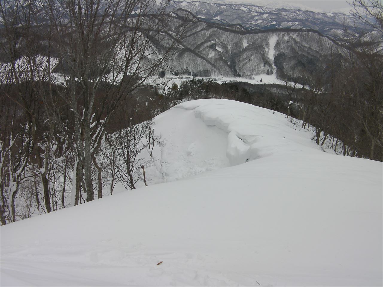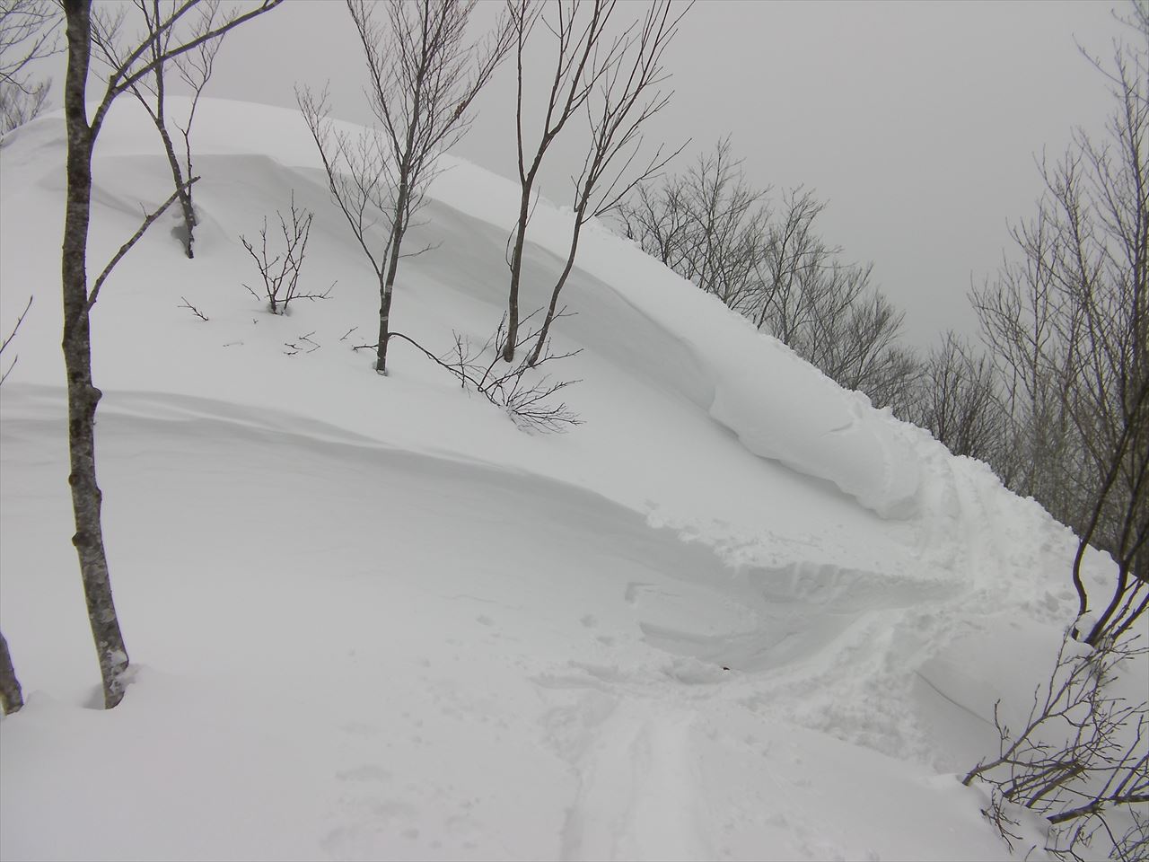 標高1080m付近の雪庇の弱点で,その尾根に上がる.