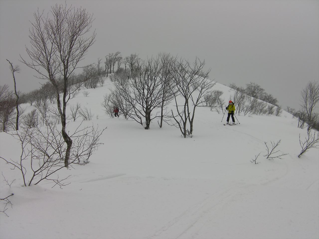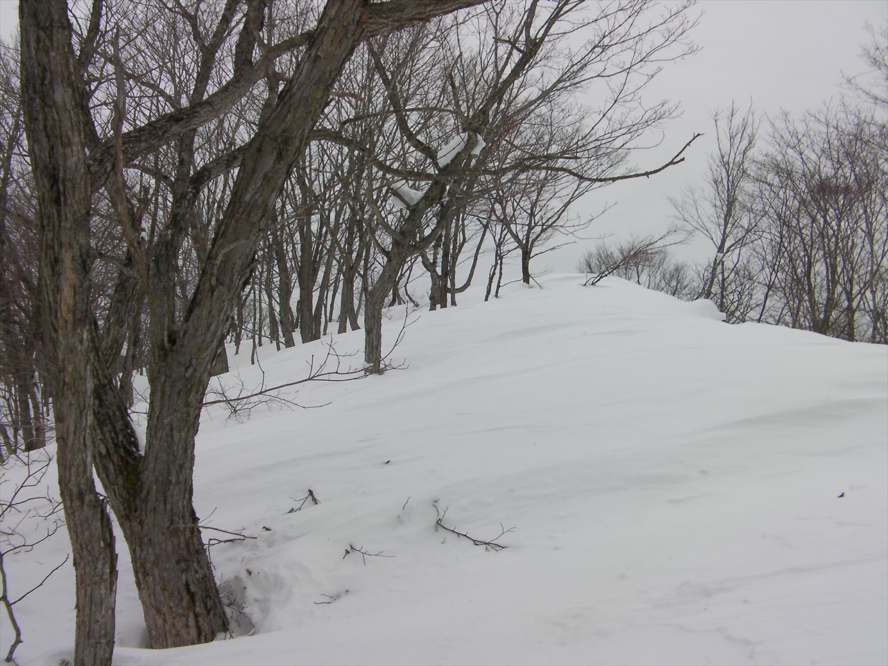 標高1400m付近で緩い傾斜がさらに緩くなって開けた斜面となり,1444m標高点ピークが顕著となる.あと一息である.