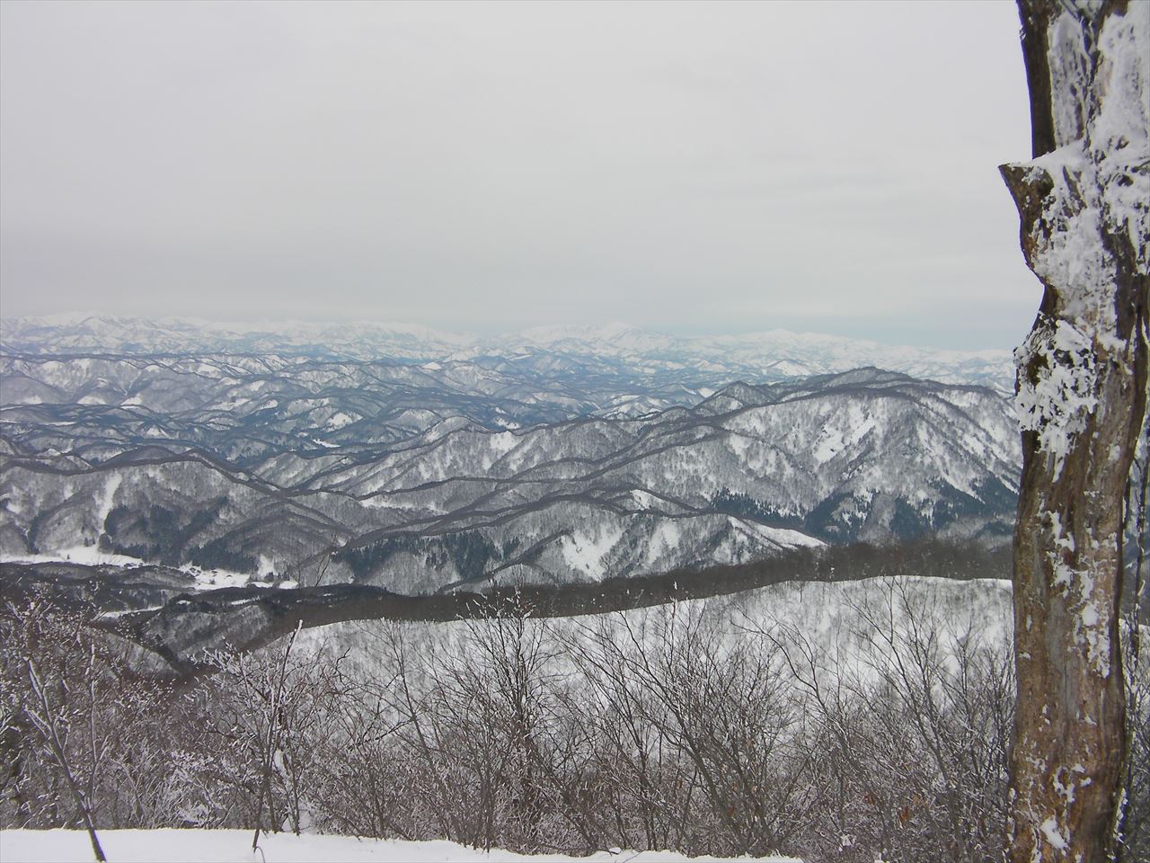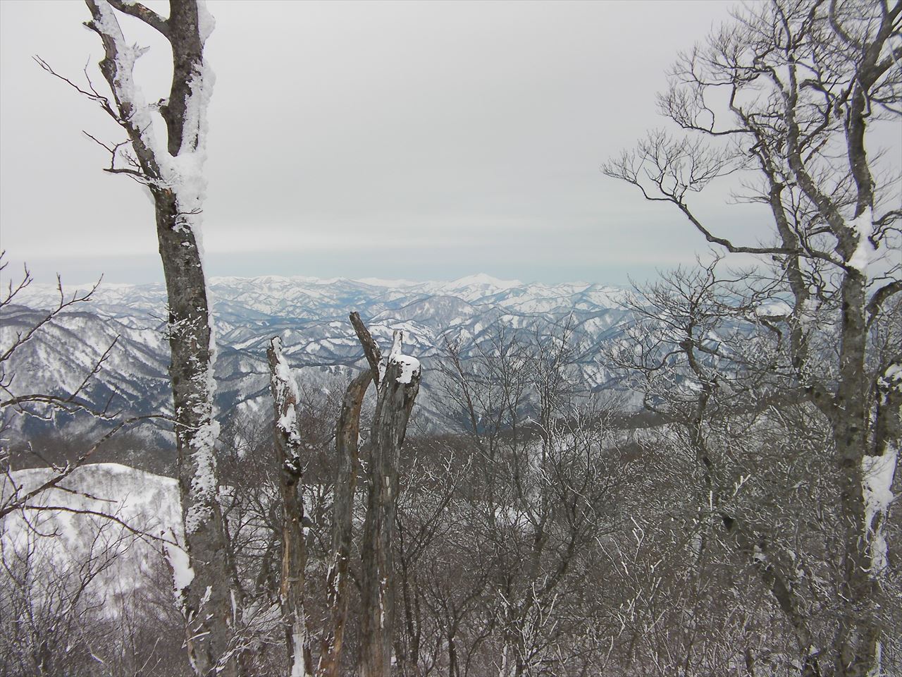 P1444m峰山頂からは東は磐梯山,二岐岳,西には尾瀬の燧ケ岳,会津駒ケ岳,北西には浅草岳や守門岳,北には意外に白く立派に見える粟ケ岳が望める.