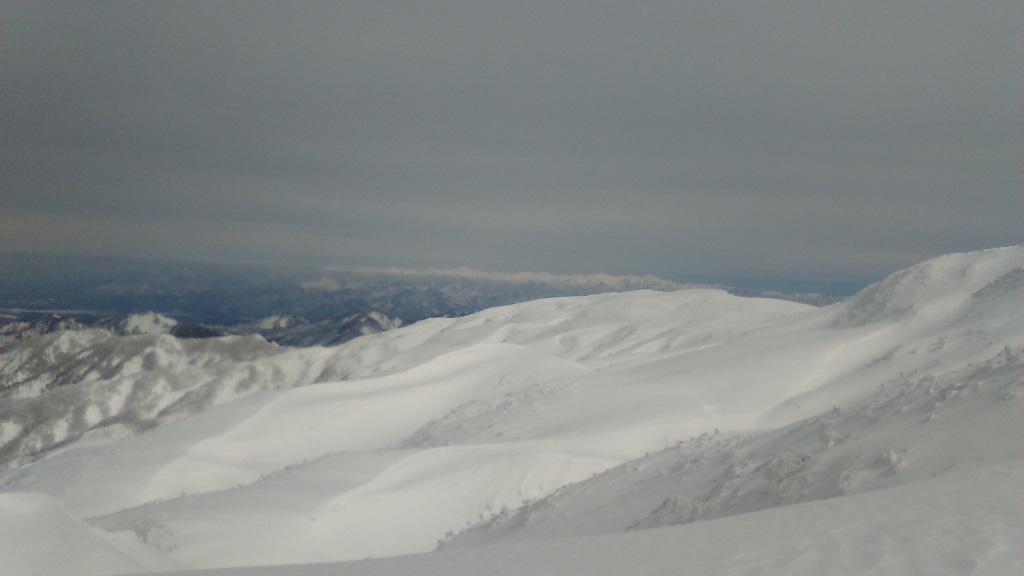 天候は曇り徐々に晴れてくる予報である。ニノックススキー場では前日20cmの積雪が報告されておりラッセルで時間がかかると思い早めにスタートするが前日のトレースが独標先の1050m付近まであり楽ができた。1100m付近で樹林を抜けると風が強く雪面の雪が流れる、自衛隊のヘリも飛来し頂上付近を旋回して去っていった。油こぼしの登りは雪の付着が良くスムーズに越えた。振り返ると六合目付近の稜線を数人歩いているのが見える。飯豊の山々は雲をかぶっていたが青空が徐々に広がってきた。頂上小屋で休んでいると知り合いのRO氏が到着したので休憩後、二人でいつものパウダーゾーン経由で下山する。お花畑付近のポールから北側の沢へ滑り込むと今日は最高のパウダーが待っていた沢底でシールを貼りルート(油こぼしの下)に復帰する。今日は超快適だったのでもう一度登り返し二度目の滑降を楽しんだ。帰路六合目付近から眺める二王子岳は美しくいつも感動する。