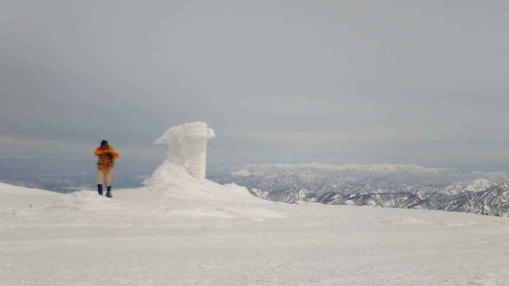 数日前の雨で雪は締まっていた新雪も麓で5cm程度樹林帯上部で15cm程度、神社からトレースは無かったがラッセルは苦にならなかった。独標先で見えた頂上には雲がかかっていたが徐々におさまってきた。油こぼしの斜面は凍っており中段からスキーを外しキックステップで登る、氷が硬く苦労した。