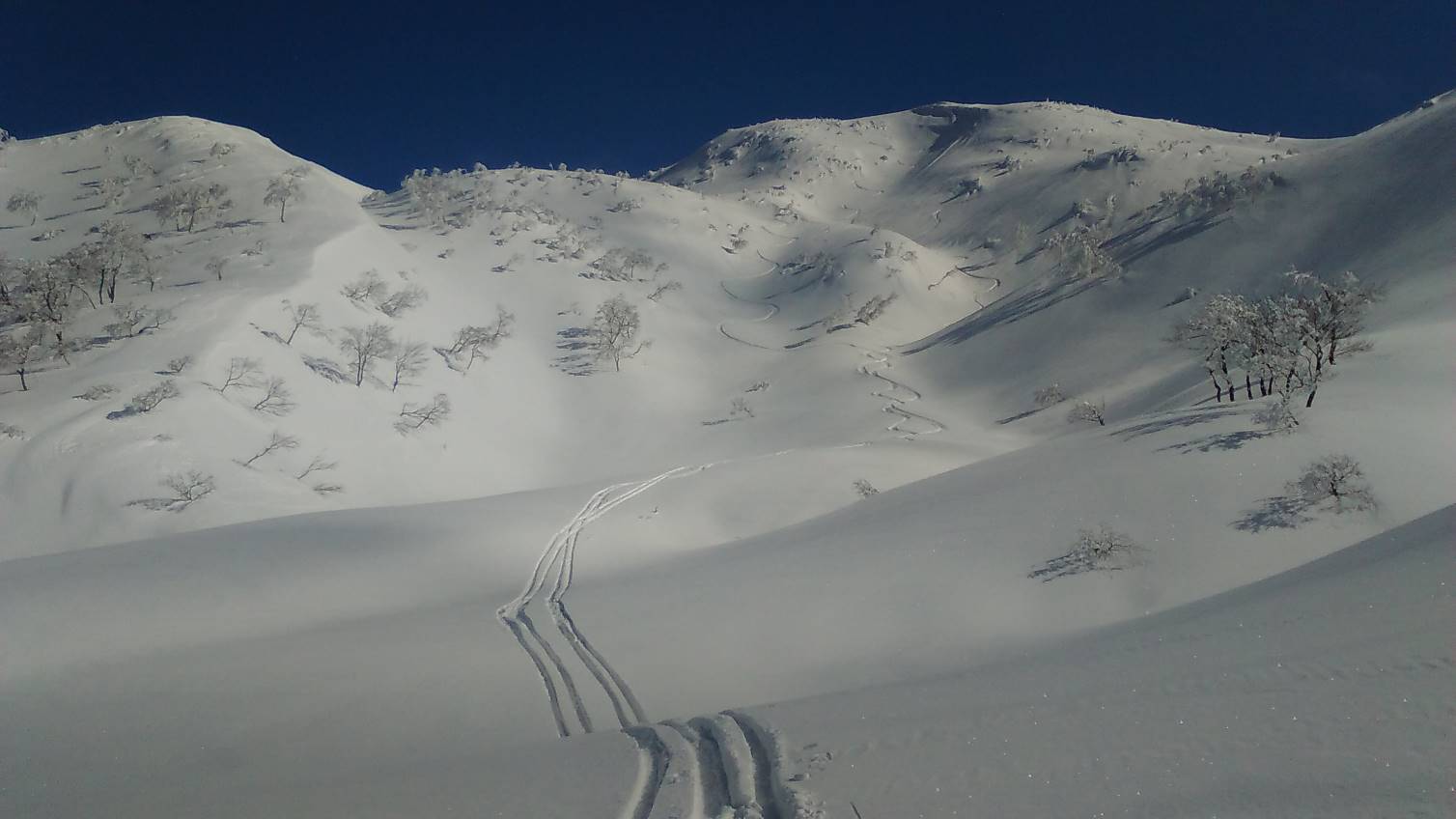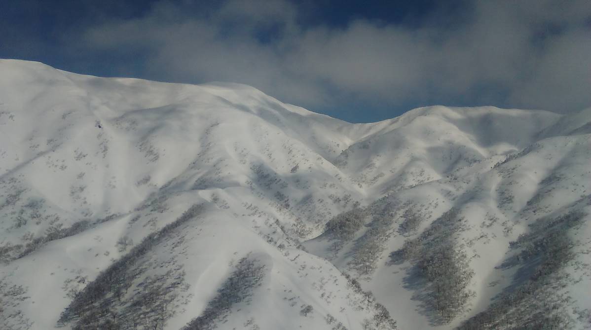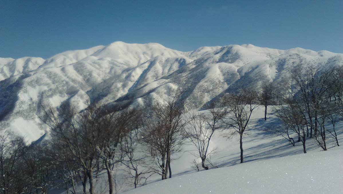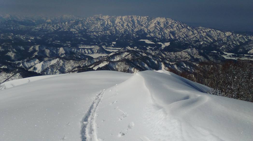 今シーズン初めての大きな移動性高気圧の到来を見逃すことはもったいないので高知山経由で二王子岳に行く。暗い中スタート、山の神の先が高知山に登る尾根の取り付きまで約1時間半。ルートは新雪の細い尾根の急登で始まるがシールの効きも良く嫌な段差も無く順調であった。カモシカの足跡が多い所に差しかかった、するとカモシカがすぐ近くの雪の斜面を駆けていった。彼らは急斜面の谷から山を苦も無く移動しているのだ。高知山直下の細尾根は風の通り道で凍った上に新雪が薄く積もっていてシールの効きが悪く、大きくジグも切れず苦労した。高知山到着は予定よりも遅れた。高知山から先の長い稜線はわずか1000m級の山とは思えない絶景がつづく今日は新雪に太陽の光が反射して宝石をちりばめた様に見える。しばらく稜線を歩いて後ろを振り返ると後続が来ていた。良く見るとスノーシューのようだ、どんどん近づいて来るので最初のスノーピークの下で待っていると顔見知りのEさん(女性)だった。場割峰から先、ルートはラッセルが予想される七滝沢源頭をさけ、稜線伝いに中尾根を経由して三王子に向かうこととする。三王子の急な登りはピッチが上らずEさんに先に行ってもらう頂上小屋ではいつものスキー仲間RO氏が待っていた。今日は気温が上らず山の上部はもちろん南俣集落までスキーが良く滑った。