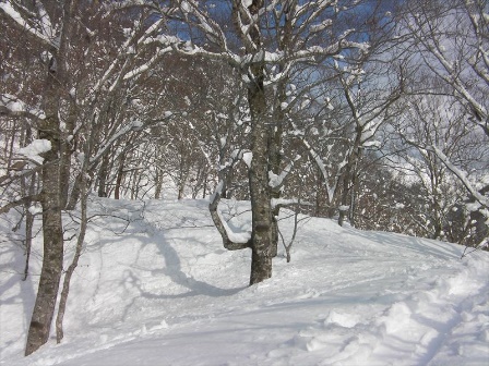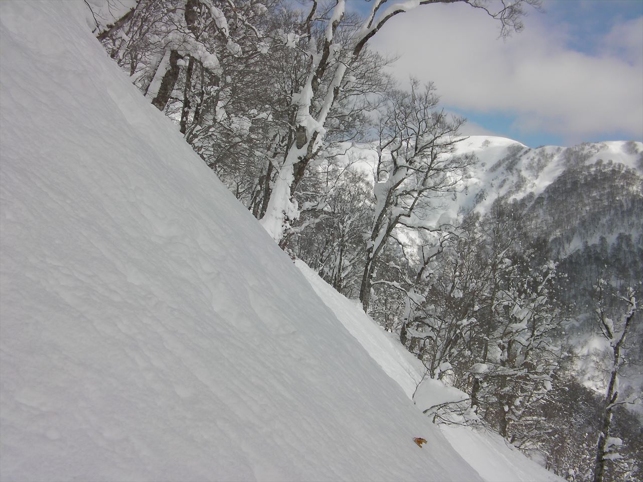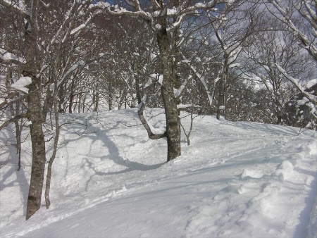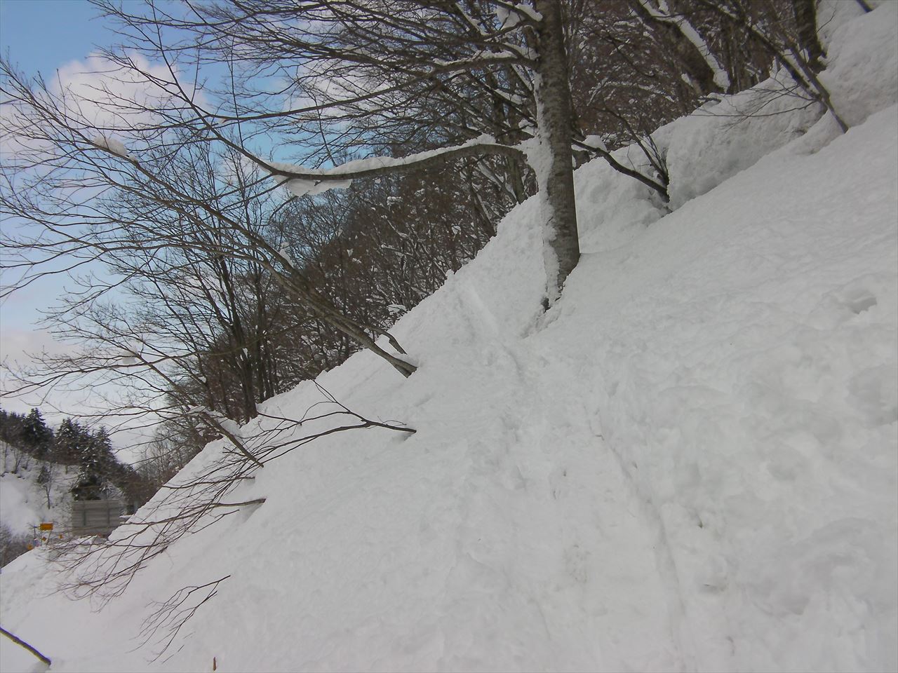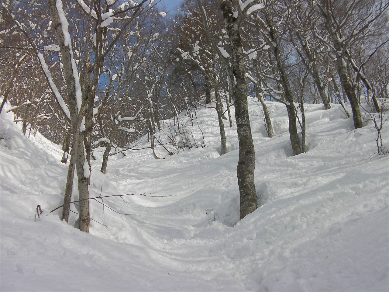 次第に雪は重くなり,登りでは気が付かなかったが盛大な滑り跡が至る所にあり,興ざめである.