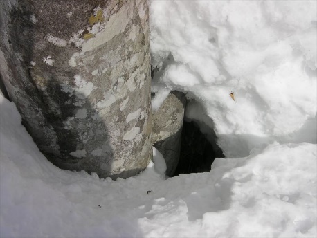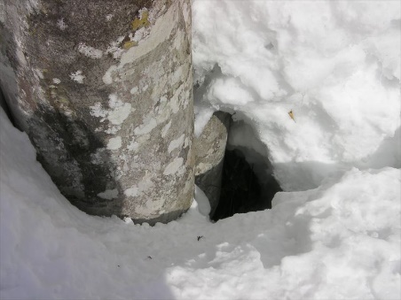 新しい雪で隠されているが,ブナの根元には根開きが始まっている.いつの間にか春である.