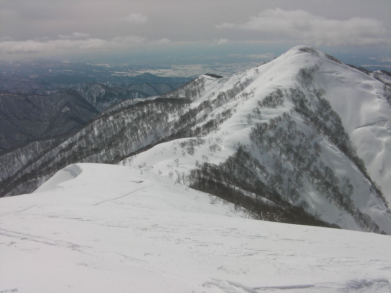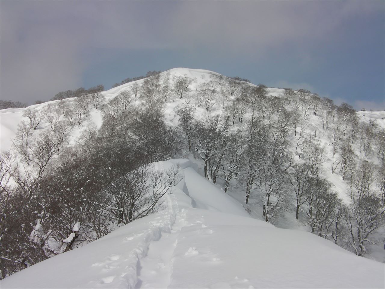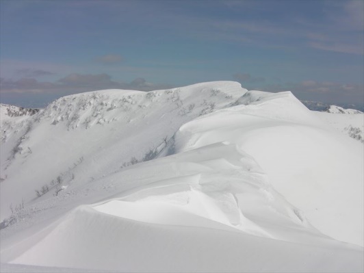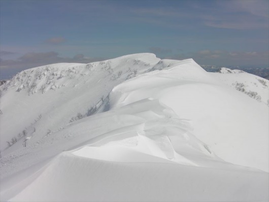 ここからは雪庇の崩落に備えて慎重に尾根を歩く.