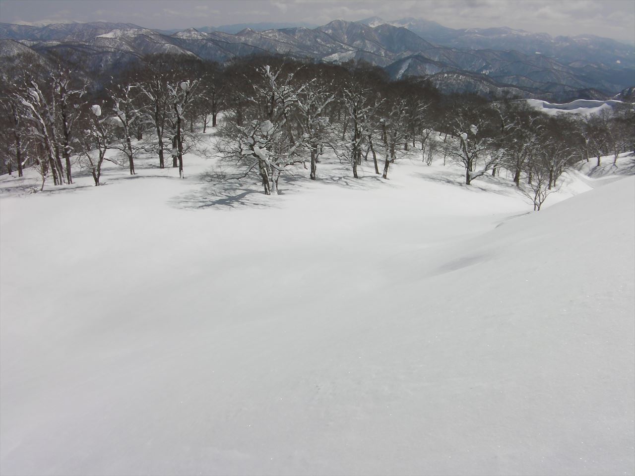 1410m台地の上を巻き,精も根も尽きるころようやく重力に任せて下向きに滑られるようになり,標高1250m付近の急斜面で登りルートに合流する.