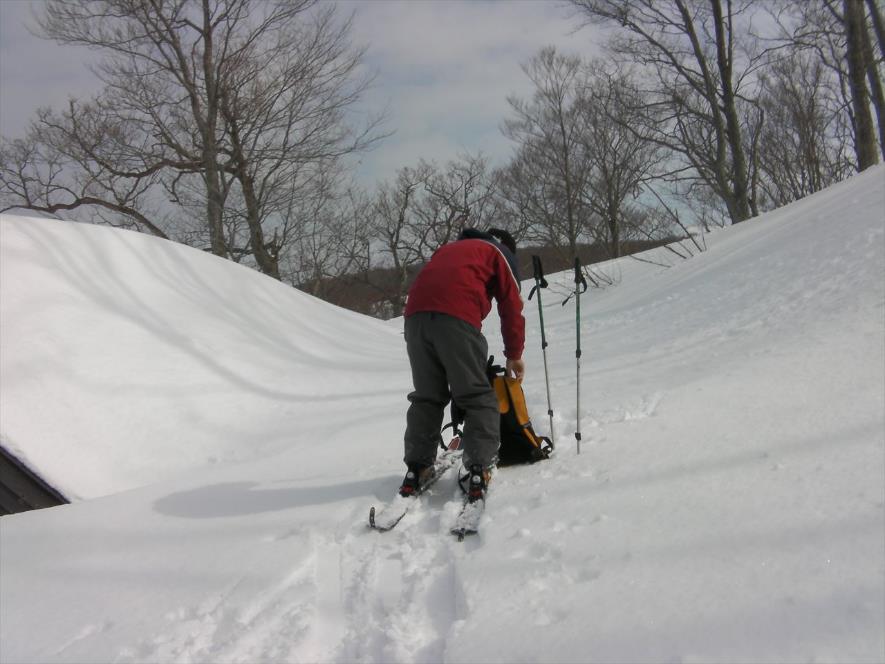 登りで苦労した雪の壁も帰りはスキーを履いたまま横滑りで落ちれば,本日終了である.
