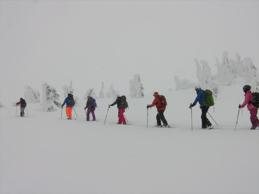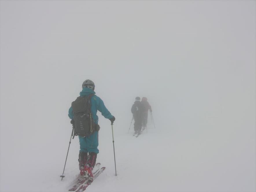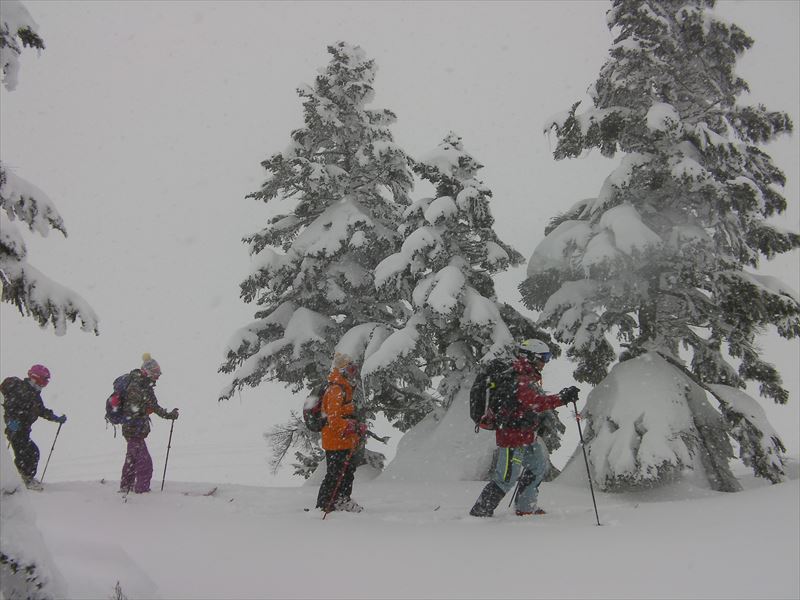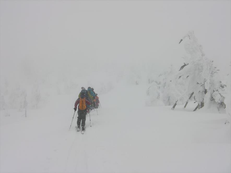 悪天の時はたいていモッコ沢コースであるが,他のトレースと被らないように美味しい斜面を選んでいく.月曜なのに新雪が載っていて前日のトレースも気にならない.