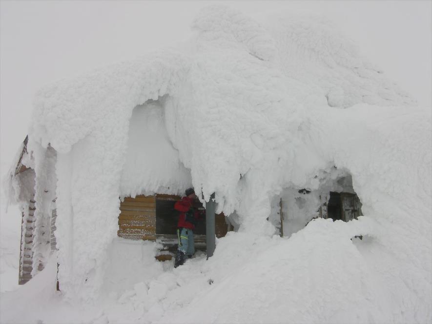 避難小屋にも盛大に樹氷が付いていて,見る向きによってはちょっと気付かないくらいだ.