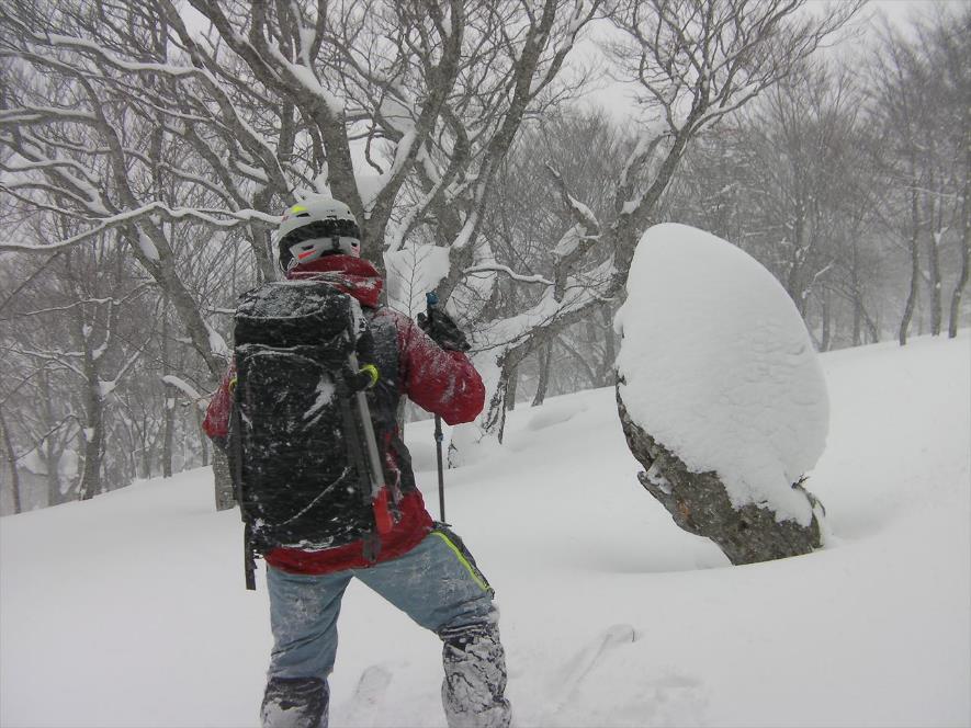 ------- 25日:箒場岱コース ------- 27日AM:銅像コース ------- 27日PM:モッコ沢コース ------- 28日:大鳴沢コース 【おまけA雪山装備】 我々が八甲田で白い粉人達になっているときに栃木県で雪山講習会中に雪崩に巻き込まれ7人の生徒と先生1人が亡くなった.合掌である. 報道によれば,雪山講習というのにスコップは各班に一つしかなく,ビーコン(雪崩トランシーバー)は持っていなかったらしい. これも報道によれば死因は圧死らしいが,各自が雪山装備(スコップ,ビーコン,ゾンデ棒)を持っていれば助けられた命があったのではないだろうか.確かにそれらを持っていても使いこなすことは難しい.簡単に埋没者を探し出せるとは思えない.だが報道が事実とすれば初めからその努力を放棄していたことが残念だ. ラッセルをする体力やスキルも大事であるが,現代には役立つ道具がある.まして,雪山講習会である.ビーコンを使った埋没者捜索訓練は必須であろう.埋没者を救うことができるのはその場にいる人なのである.各自にスコップやビーコンを持たされずに雪山講習会に連れていかれ,亡くなった前途ある生徒に改めて合掌である. 我々のように誰に頼まれたわけでもなく自分で好きに雪山に入って雪崩に逢うのは仕方がない.納得!自業自得である.それでも,家族や捜索をすることとなる関係者のことを考えればなるべく雪崩に遭遇しないことや,万一そうなったときには探してもらったり埋没者を助けられるようにしたりできるだけの努力はしたい. 雪山に入る以上スコップ,ビーコン,ゾンデ棒等を携帯しよう.最低でもスコップは持っていこう.スコップは決して宴会場を作るためだけにあるのではない.埋没者助け出すためや風を避けるための雪を掘るのに必要なのだ.誰かが持っていてもその人が雪に埋まったり,はぐれて一人になったりした時のことを想像してみよう.夏の山とは違うのである. 第一それを携帯しないことは,埋没者を助けることを放棄しているのである.雪山は連れて行ってもらうものではない.皆で協力して登るのである. 自分のため,家族のため,仲間のため,そして危険を冒して捜索してくれる関係者のためにも雪山に入るときの装備を各自携帯しよう.