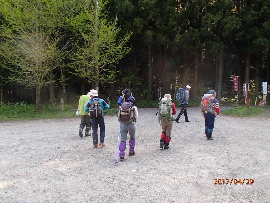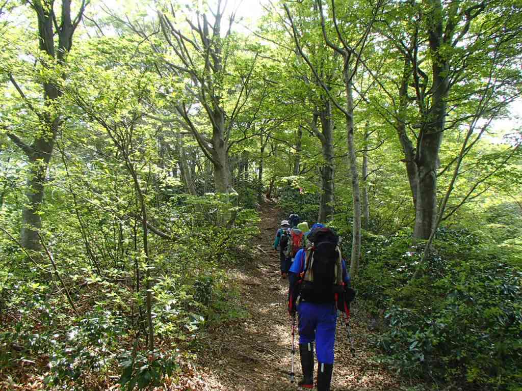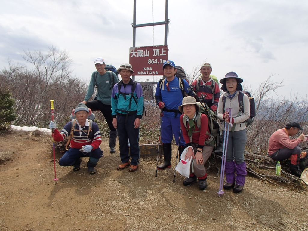 2017年4月の2回目の会山行は大蔵~菅名の周回登山。8名の参加です。いずみの里駐車場からまずは大蔵山を目指す。新緑のブナ林が清々しい。2時間20分ほどで大蔵山山頂。ここまでほとんど雪は無かった。菅名岳迄の稜線の途中で昼食休憩することとして記念写真をとった後、すぐに出発する。稜線はまだ多くの残雪が残っているおり、ほぼ雪の上を進む。展望は抜群だ。五頭や川内の山、飯豊の峰々など360度の展望が楽しめた。