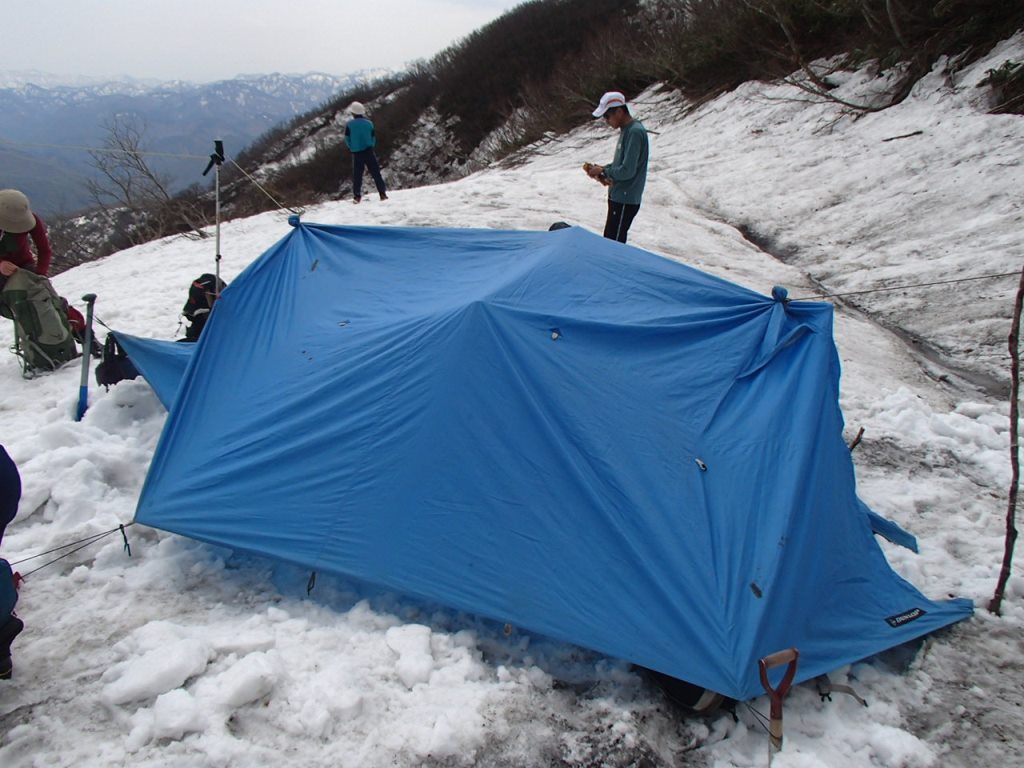 ほぼ中間点の一段降りたところに平な場所があり、そこにフライシートを張り、昼の休憩場所の設営作業を開始する。設営はお手のもので瞬く間に、立派なものが完成した。回りは雪だが、中に入って、カズバーナーに点火すればもう別世界である。