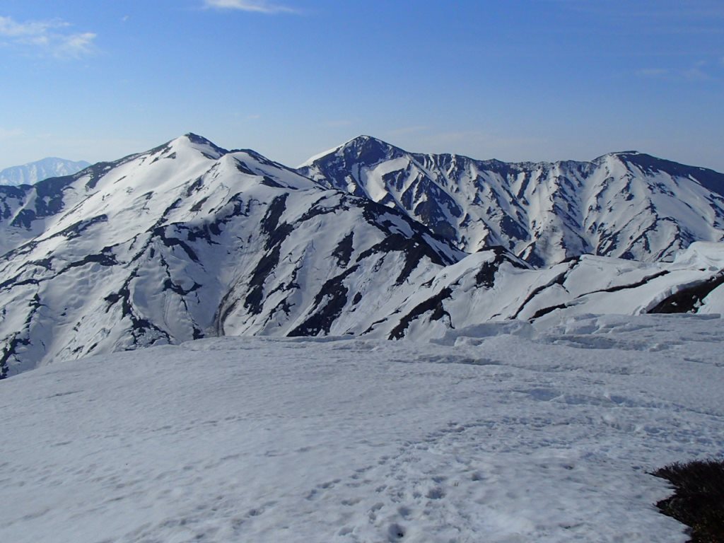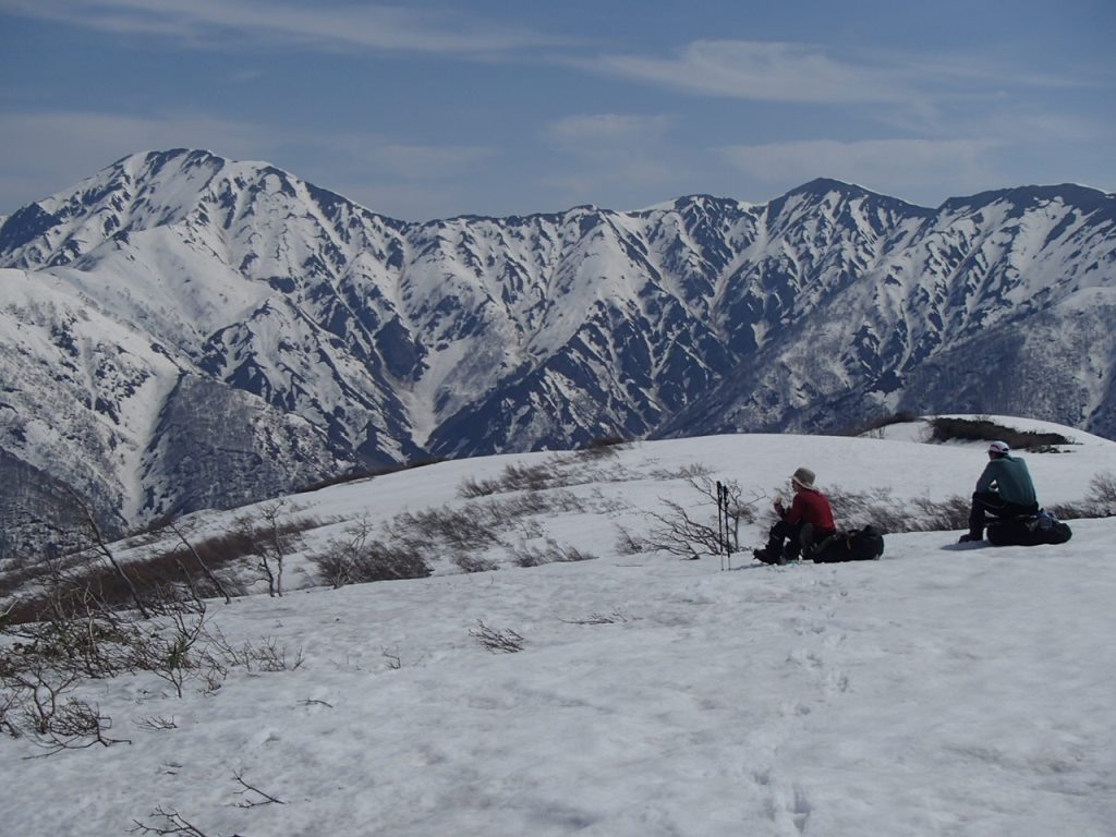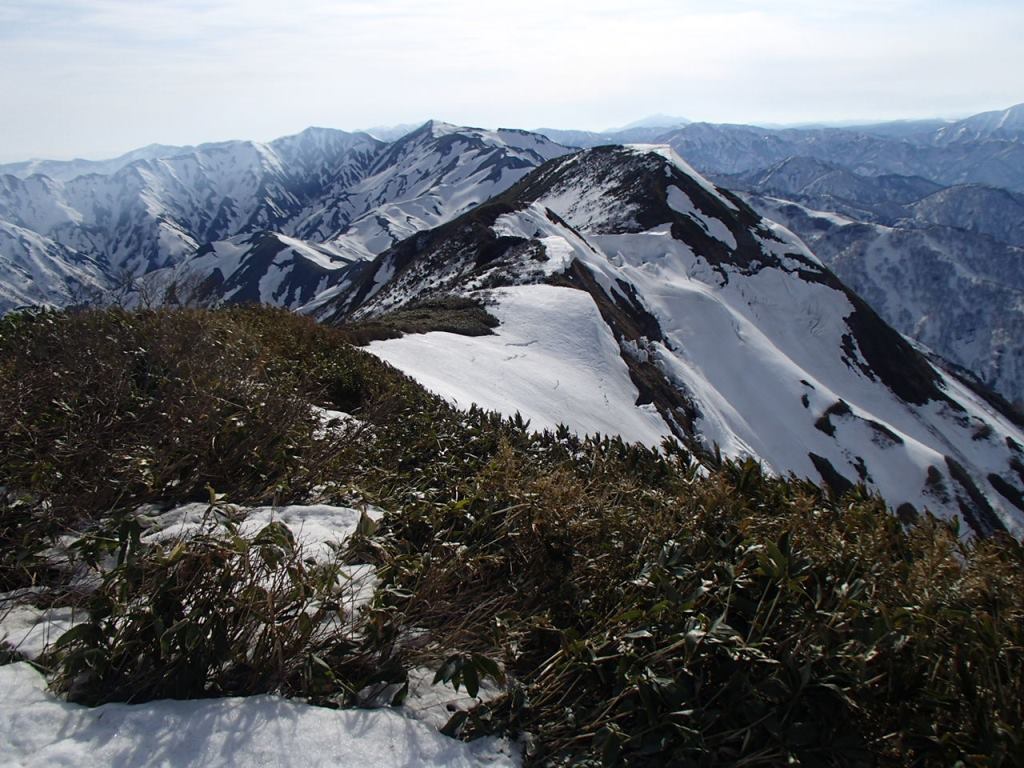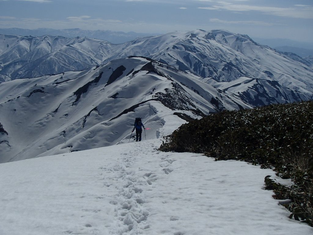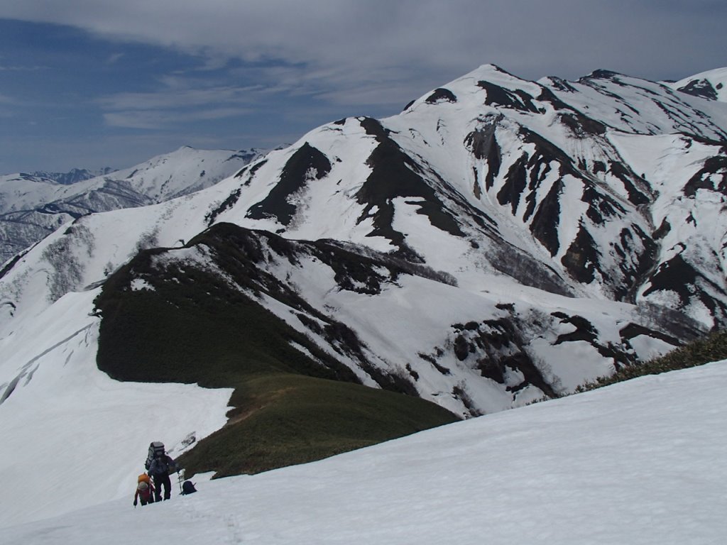 翌朝5時起床。朝食を食べ、早めにテントを撤収。越後三山をバックに記念写真を撮って出発する。ここからも稜線は細く、藪が多い。ピークの乗り越しも大変だ。大きく下ってからネコブ山までの登り返しに1時間40分を費やす。ネコブ山の(耳)で休憩。良く歩いたものだと稜線を見渡す。それにしても絶景だ。山の険しさ、スケールとも日本の山岳景観の中でもトップクラスではないか。雪はそれらの山をさらに立派に見せる。