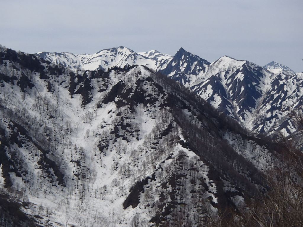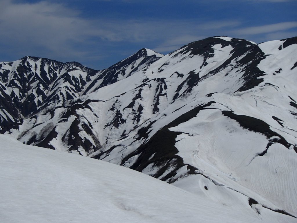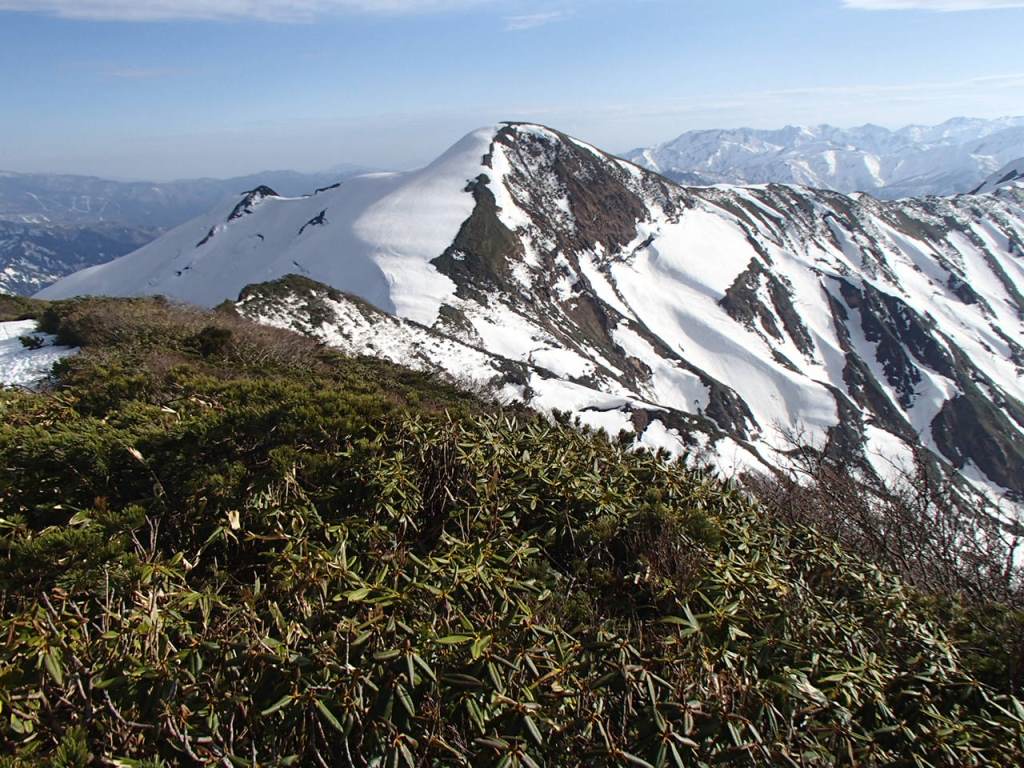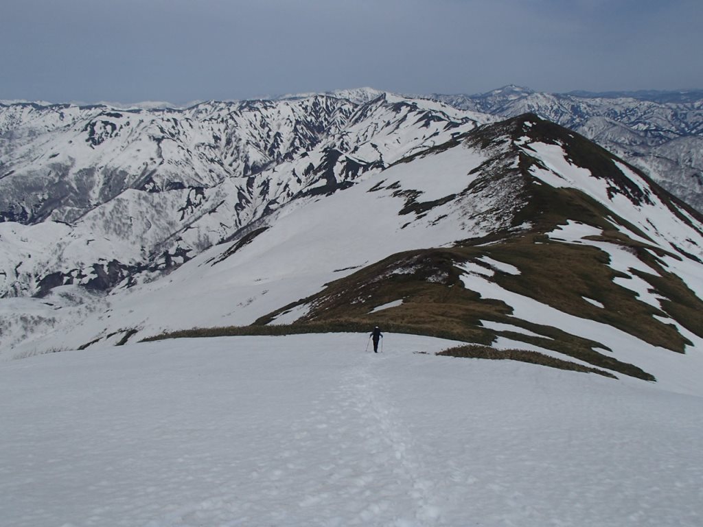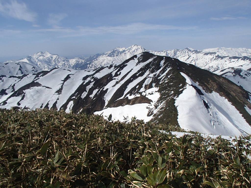 翌朝5時起床。朝食を食べ、早めにテントを撤収。越後三山をバックに記念写真を撮って出発する。ここからも稜線は細く、藪が多い。ピークの乗り越しも大変だ。大きく下ってからネコブ山までの登り返しに1時間40分を費やす。ネコブ山の(耳)で休憩。良く歩いたものだと稜線を見渡す。それにしても絶景だ。山の険しさ、スケールとも日本の山岳景観の中でもトップクラスではないか。雪はそれらの山をさらに立派に見せる。