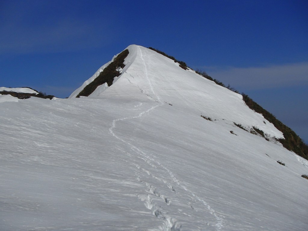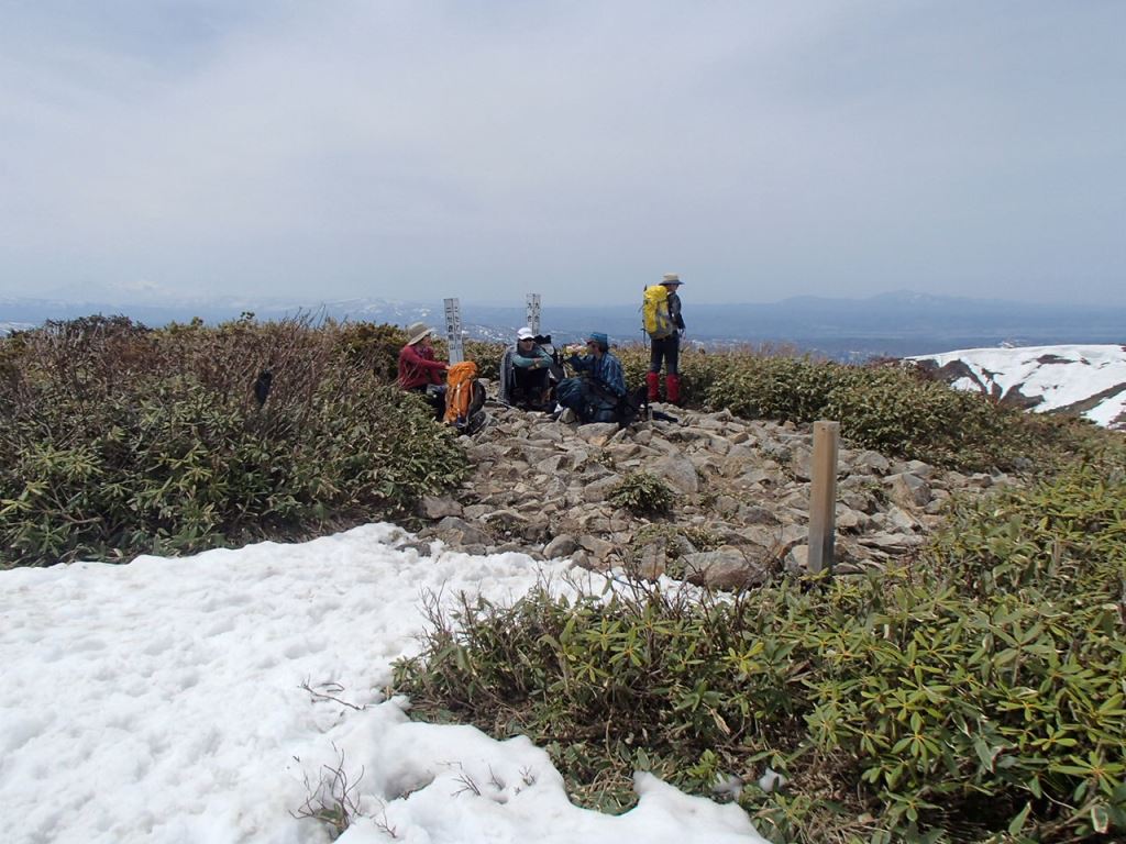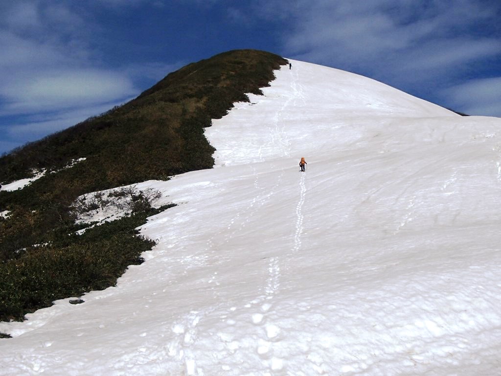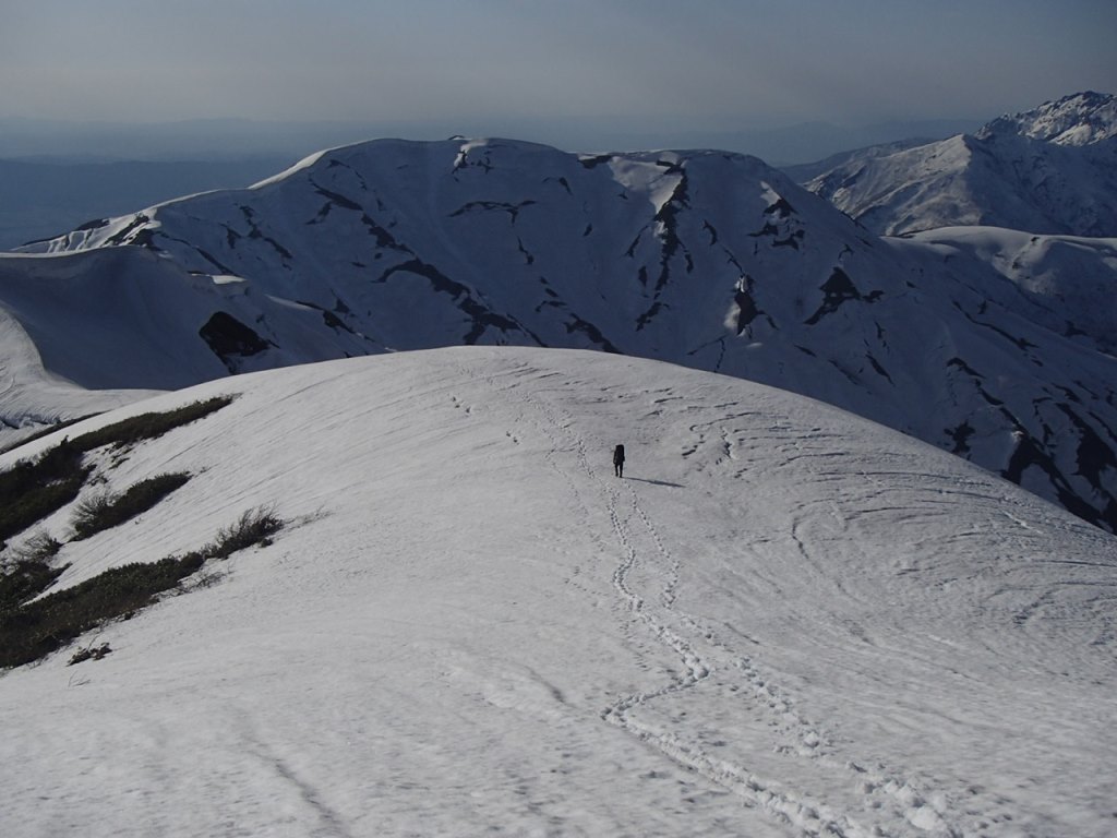 行く先に目をやると今度は今回の稜線の最低鞍部まで深い笹薮だ。アイゼンを外し笹薮を下る。ところによって人の背丈程もあるので、逆方向に縦走するのはさぞ難儀だと思わせる。