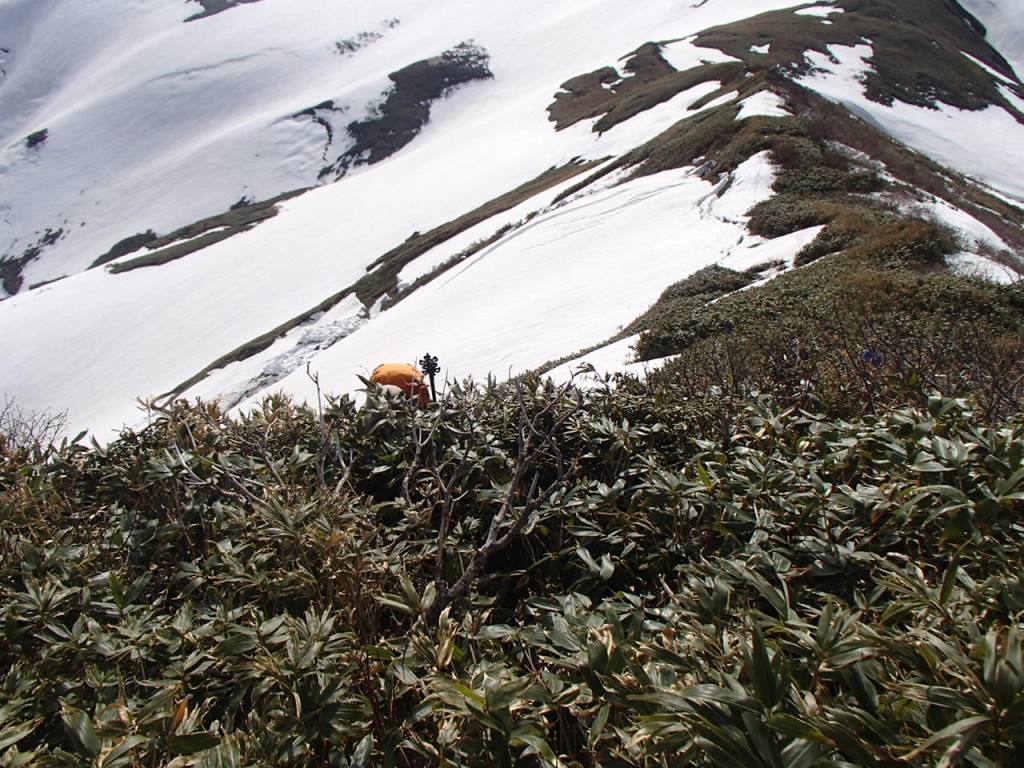 なんとか今日のうちにここまで着いた。あとは下りながら、テント場を探すだけだ。ネコブ山へ向かう稜線にテントが1張あり、我々よりも年配の夫婦がおられた。3泊目とのことだが、この稜線を縦走しているとは恐れ入りました。よほどの山ヤ夫婦なのでしょう。