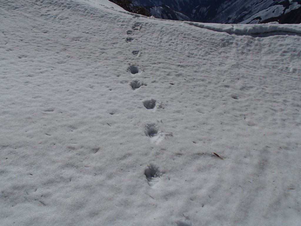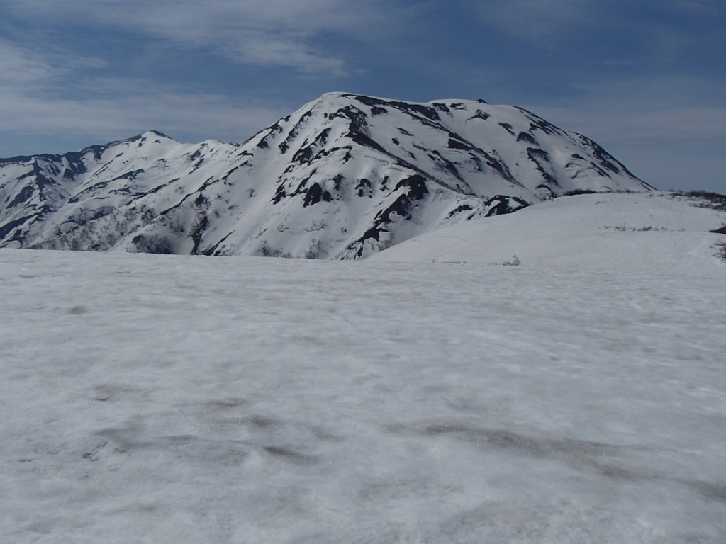 しばらく感慨に耽り、下津川山に向かう。大きな雪面を自由に下る。今日一番の快適な下りだ。下りきった鞍部には通ったばかりの熊の足跡があった。少しでも時間がずれて遭遇しなかったことは幸運だ。早々に立ち去ろう。ここは彼らの居場所で我々がよそ者なのだ。