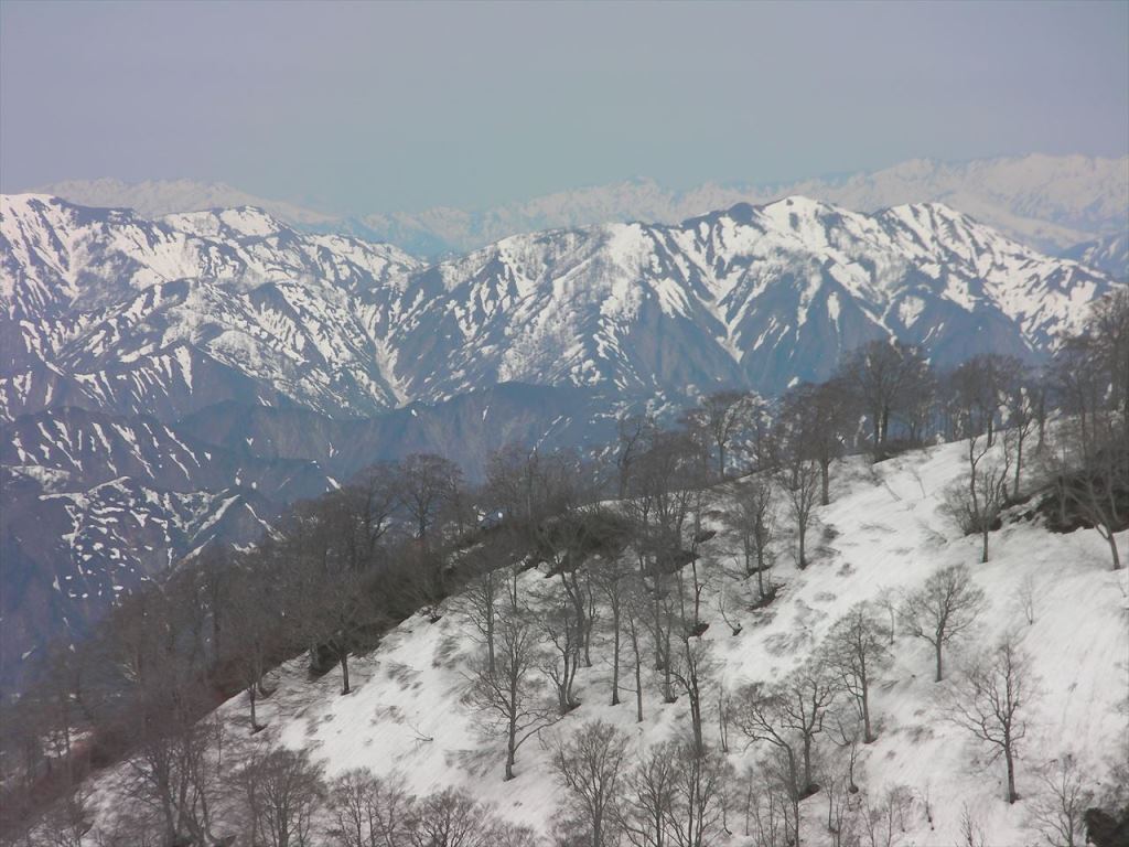 反対側には越後三山や特徴的な荒沢岳,平ケ岳,とんがった景鶴山なども確認できる.