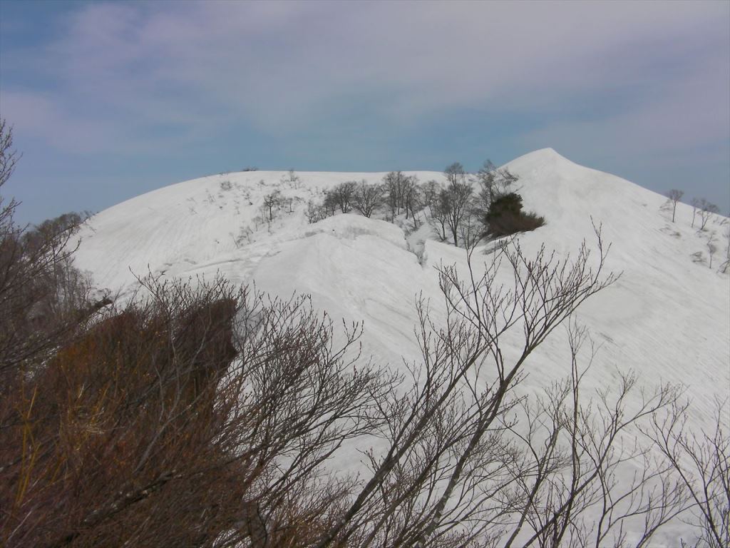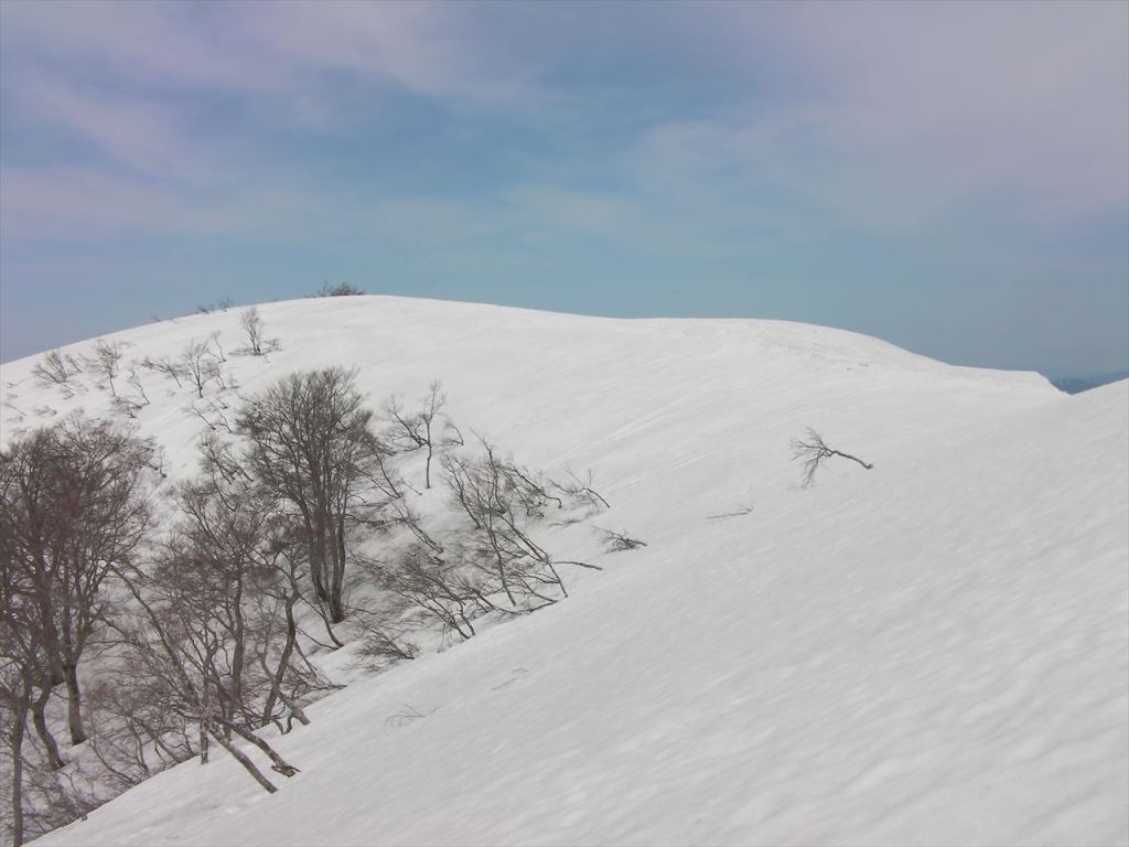 雪割れに気を使いながらとぼとぼと歩くとようやく山頂の丸みが近づく.