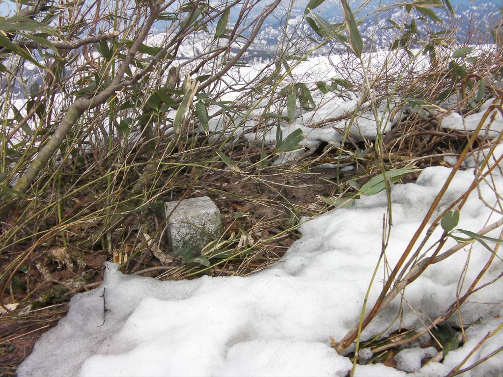 2mくらい藪を降りれば雪はつながっているようにも見えるが,板を持って藪を登り返すまでもないので,ここに板を置いてツボ足で山頂に向かう.