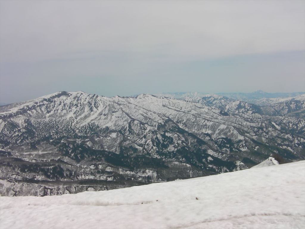 通称「小黒姫」から守門黒姫に至る稜線が白い屏風のように広がる.