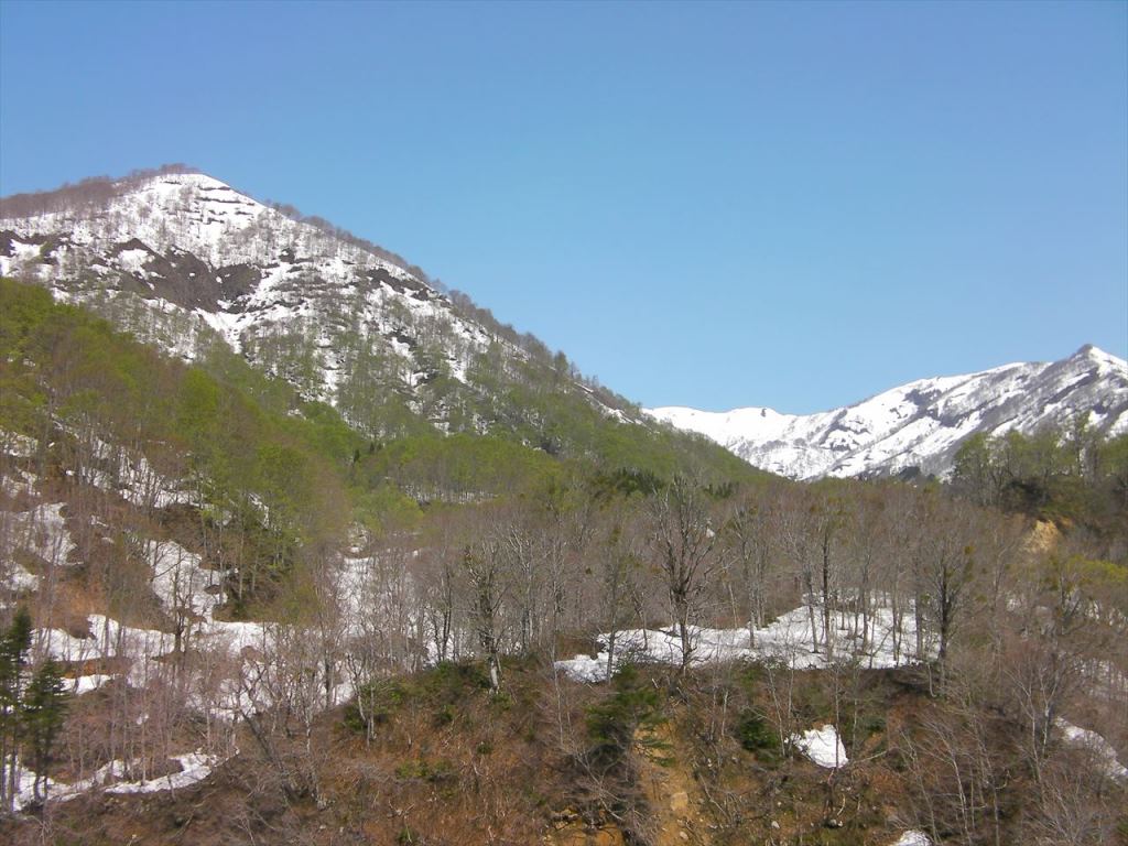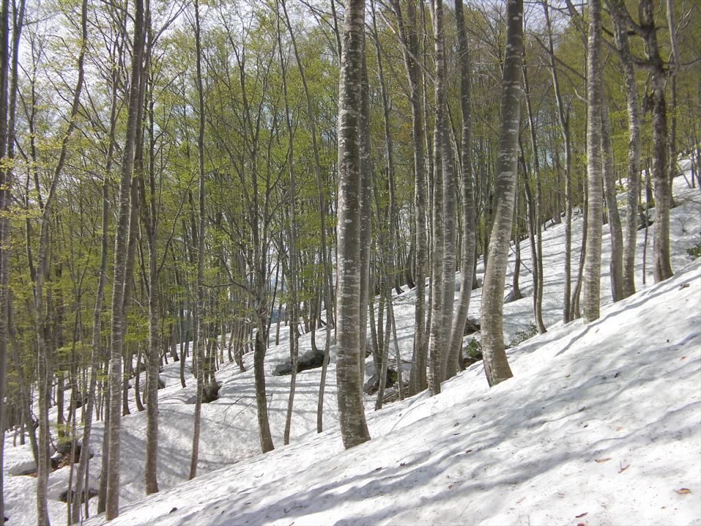 その斜面のブナは細身だが,新緑が残雪に映えて素晴らしい.