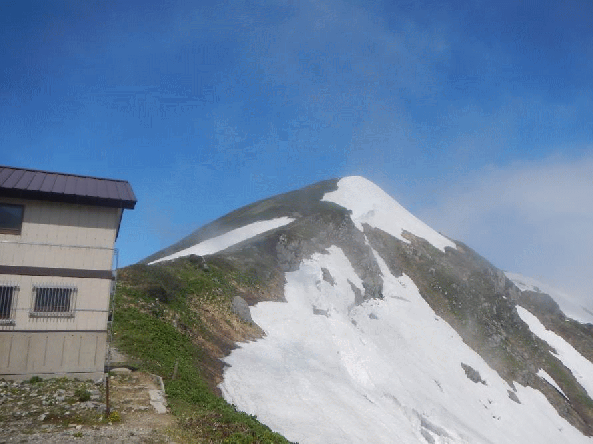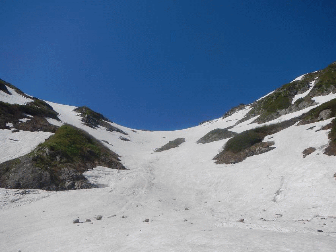 <中ノ島から雪渓を左方面に突き上げると梅花皮小屋だ>