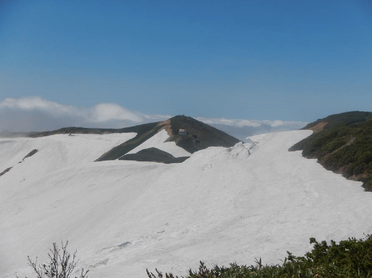 地神北峰からは丸森峰まで雪渓で、あとは夏道となった。誰にも会わないかと思ったが、雪渓で登ってくる1パーティーに会い、長い下りでは4人と1匹!?に抜かされ、なんとか飯豊山荘に着いた。