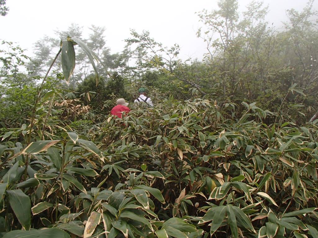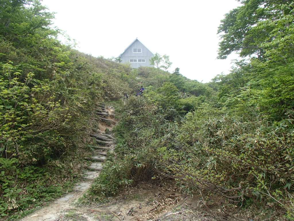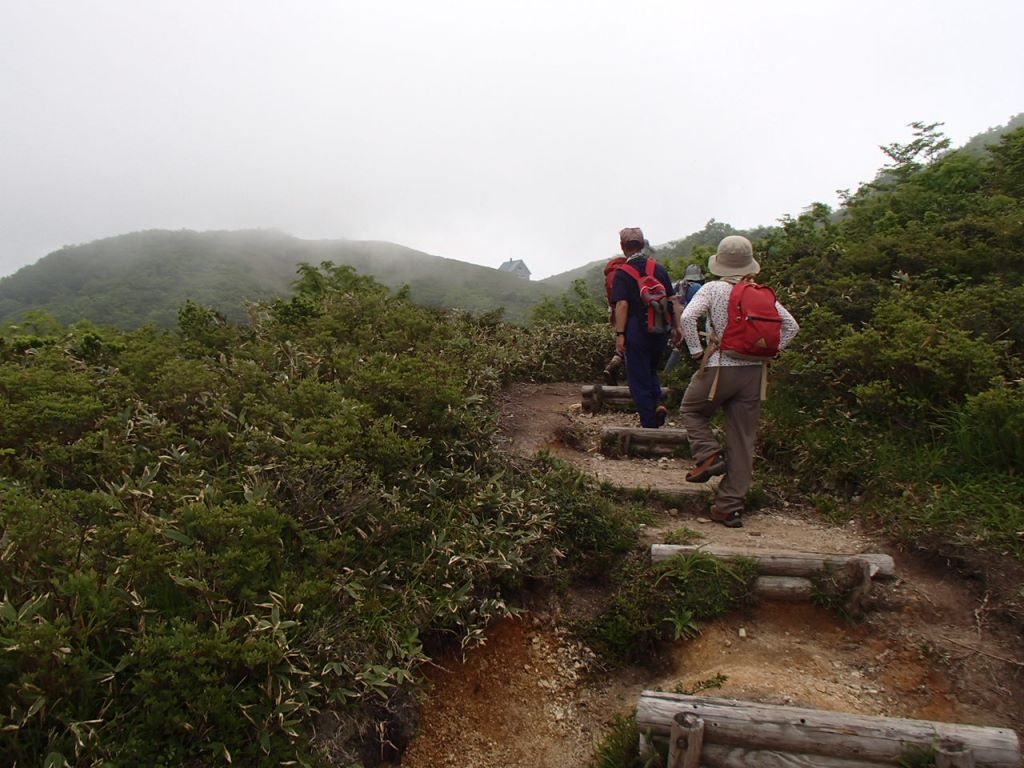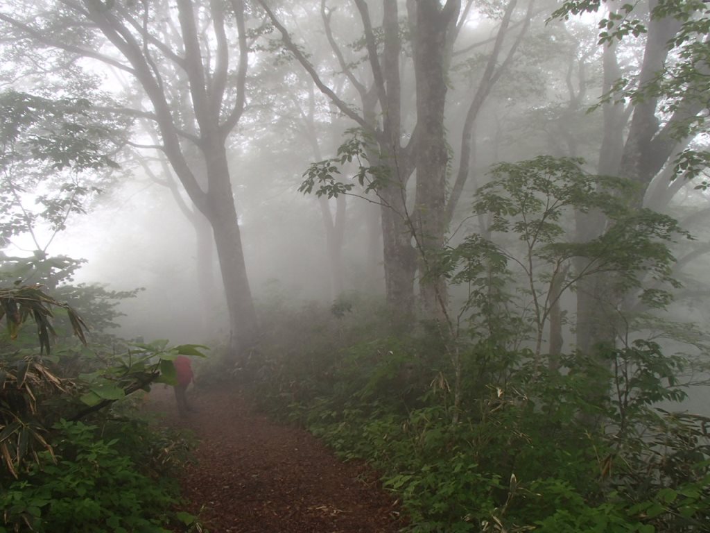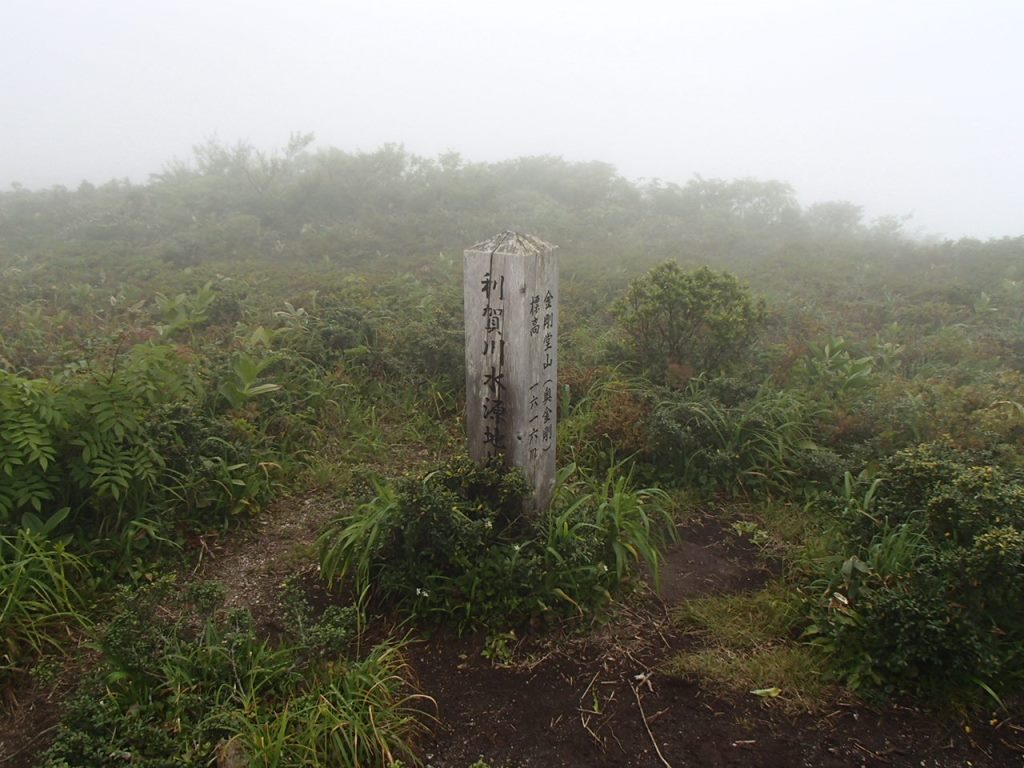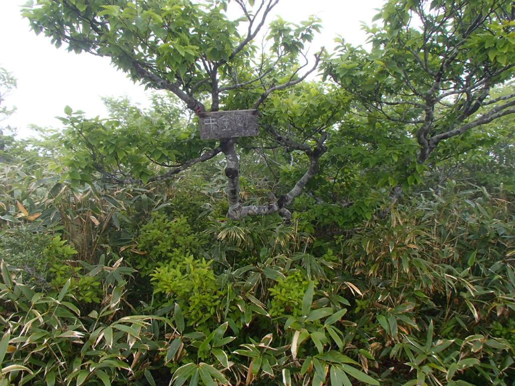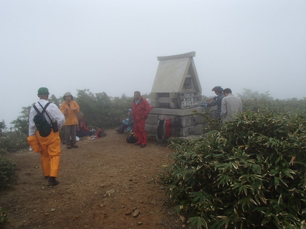「ぎゃあぁ!靴忘れたぁ〜!」なんと登山靴を公民館に忘れてきてしまったのだ。水が枯れた花のように、しおれた俺にT口さんが「鍵を又、借りなければならないので」と言って一緒に取りに行ってくれた。他の人には先に登っていてもらう。片道約30kmの道を戻り、玄関に置いてあった登山靴を取ってまた折り返す。自分の馬鹿さ加減に情けなくなる。2度目の登山口到着だ。時計は8時をとうに回っていたがまあしょうがない。T口さんと一緒に登り始めた。山頂までの標高差は870m程だが登山道の傾斜は比較的穏やかで登り易い。樹林帯の為か朝降っていた雨も登山道をそう濡らしてはいなく、歩き易かった。途中の大きなブナ林はとても見事だし、コケモモも沢山花を咲かせていた。(後で調べたらアカモノでした)登り始めて2時間10分位で山頂前金剛先に出ると、先に出発したメンバーが昼休憩で休んでいた。