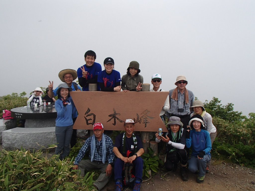 富山県在住の会員T口さんに会山行を担当して頂いた。山は白木峰と金剛堂山。共に全国の200、300名山に名前を連ねる名峰だ。新潟からの参加者は7名。又、会員の親戚で富山在住のご家族4名の合流もあり、1日目の白木峰は総勢12名の大部隊となった。
