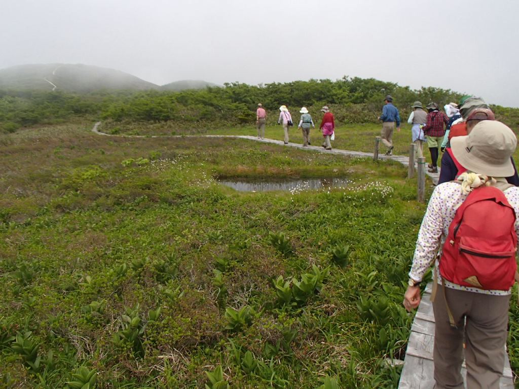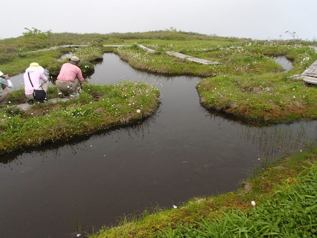 山頂部はおだやかな景色が広がる。天上の楽園という感じ。ガスで見通しがきかないがきっといい景色なんだろう。山頂は12人がくつろげるような広さがない為、少し休んでから20分程歩いて浮島の池へ移動する。割と小じんまりとした池で小さな島が浮いている。(押して確かめたわけではないが)神秘的な情景である。