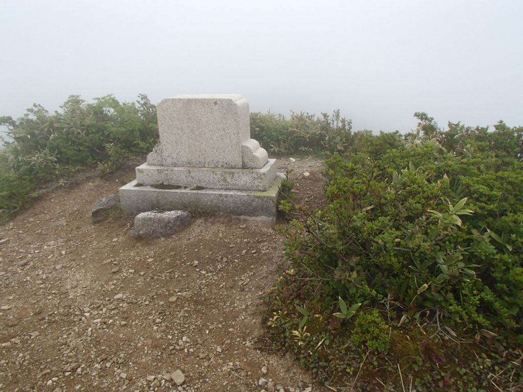 合流できてよかったと思いながら、急いで昼食を取っていると、ガスで何も見えないから皆がここで帰ると言う。「え〜!奥金剛迄行かないのぉ〜!、行かなきゃだめでしょ〜!」と叫んでいたが、8人中5人があっさりと下山して行ってしまった。なんて諦めの良い人達なんだ。諦めの悪い俺とW女子にリーダーT口さんは付き合ってくれ、奥金剛まで歩く。途中カエルの池があり、近づくと一斉に水の中に隠れた。最高点の中金剛には歌碑と中金剛の下げ札があり、奥金剛には標柱が建っていた。ガスのため展望は無かったが、行ったという充実感がある。よかったよかったと思いながら下山した。