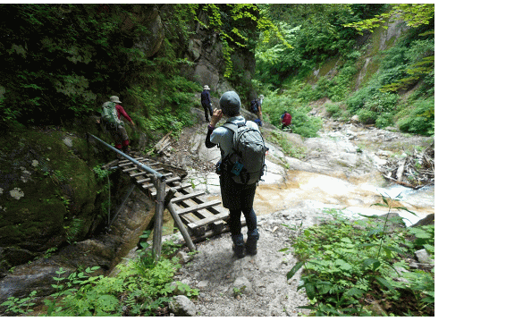 歩きだしてまもなく温泉旅館の方からこのコースは崖崩れ、道の不明な所があり、まだ戻ってこない人がいると聞かされた。気分が悪くなった。でも、思いは餓鬼岳。道に迷ったら引き返そうと全員一致で突撃した。