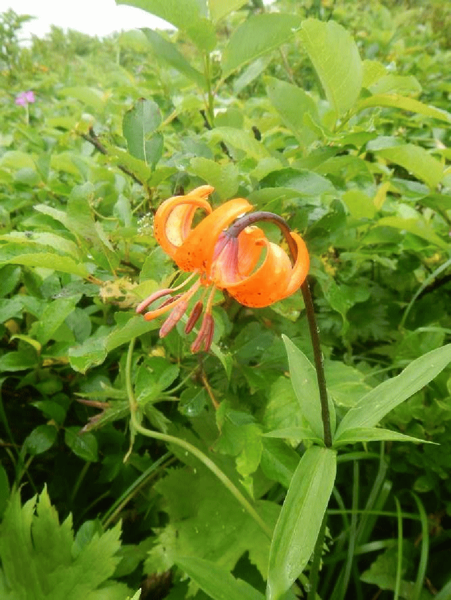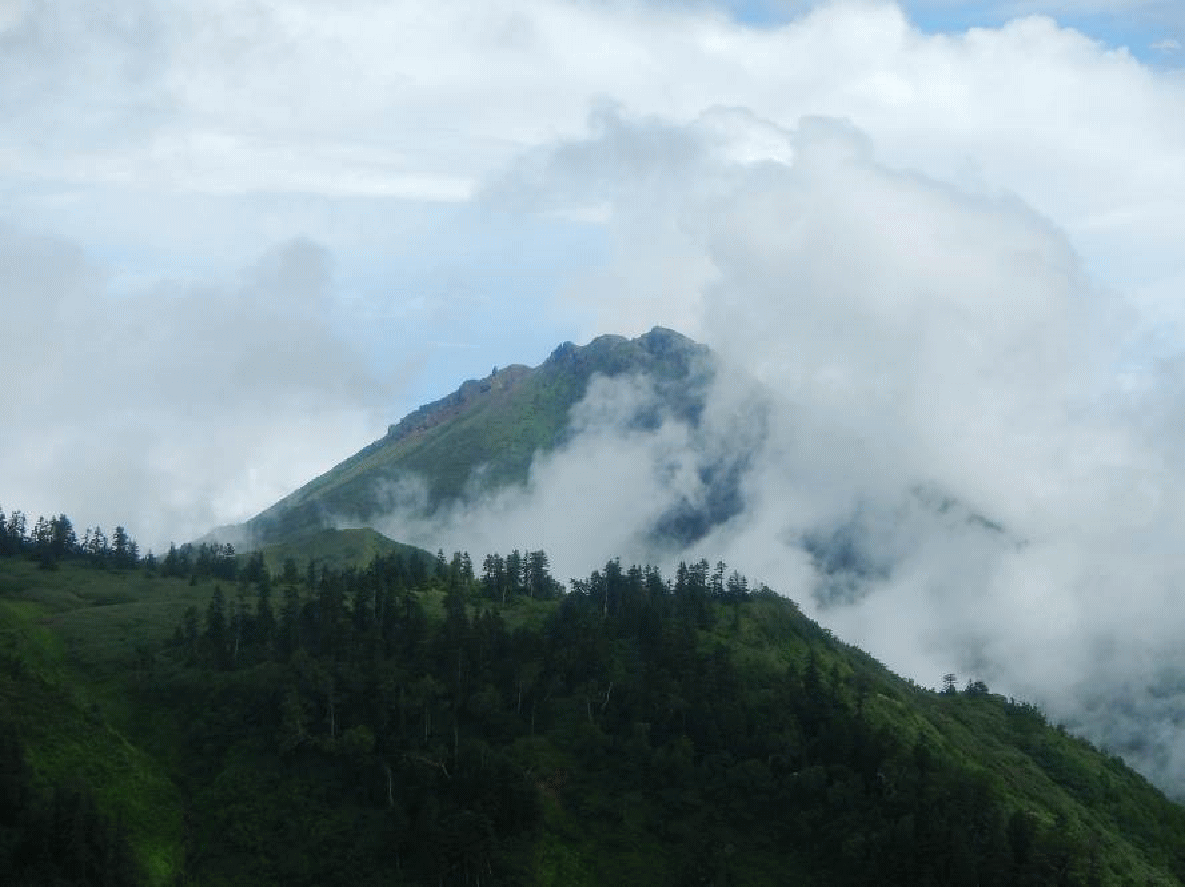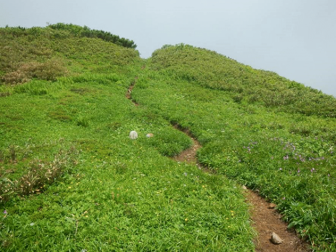 久しぶりに金山に出かけた。天気予報は一時雨みたいなことだったので、長靴に傘を持って歩き出す。水場までは順調そのもの。水場からはアップダウンを繰り返しながら登って行く。ガレた斜面のお花畑を過ぎたところで雨が降り出してきた。予想していたとはいえ雨模様。とたんに気持ちがくじけてしまう。いったん戻りかけたが、小雨になったところで気持を奮い立たせ!?登り返すことにした。水場から天狗原山までが長く、遠く感じられた。