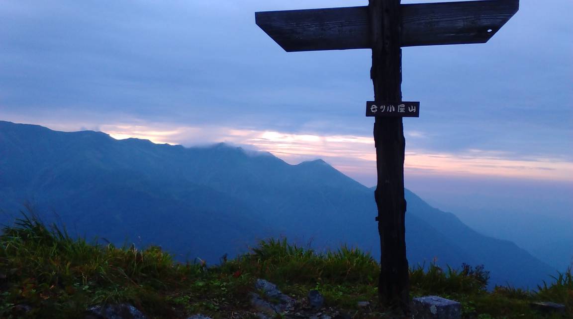 日の出前の七つ小屋山頂上バックは昨日歩いた白毛門から朝日の稜線