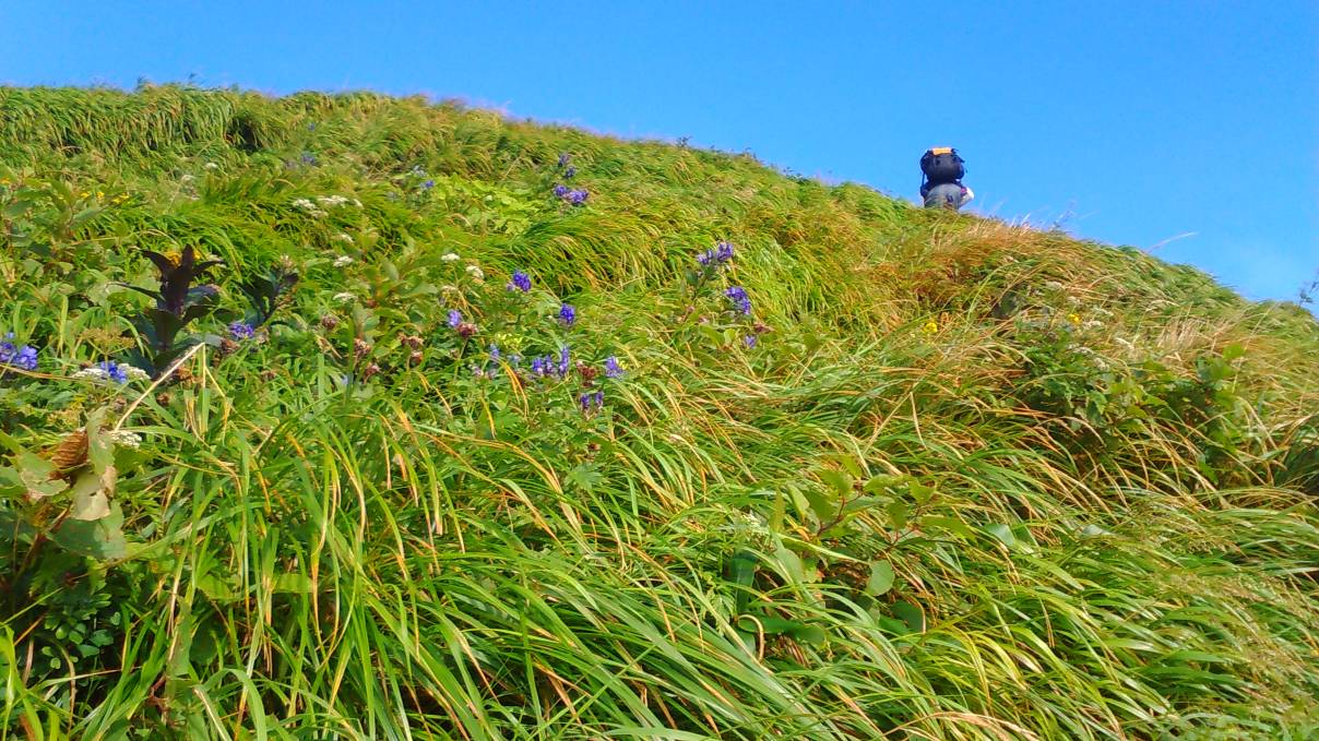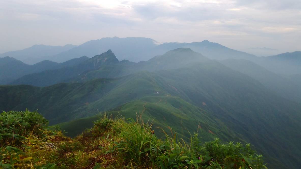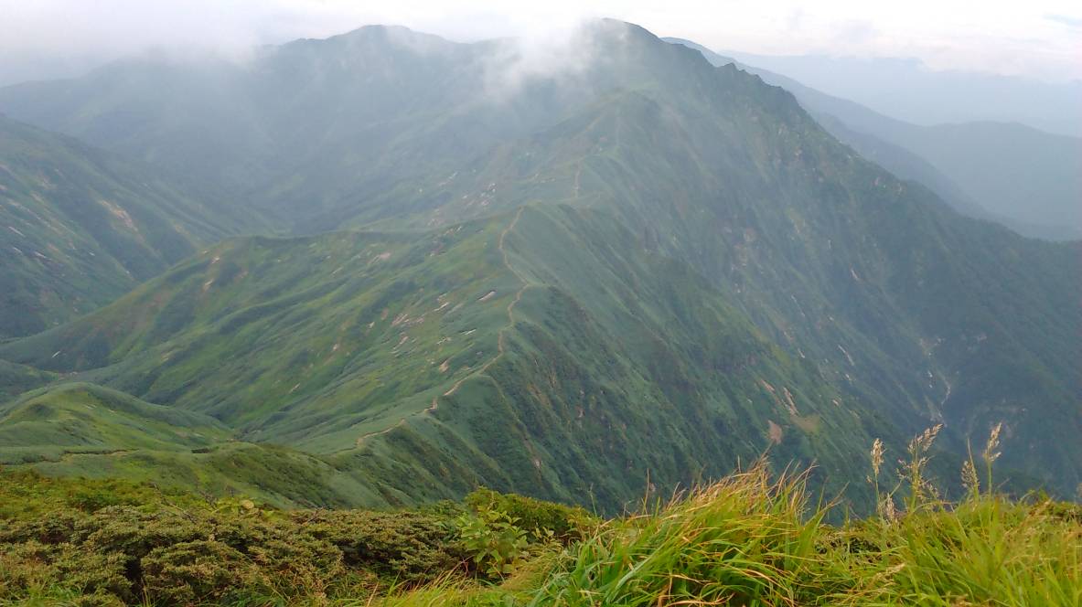 樹林帯の急登、時々吹く涼風に元気を得る。松ノ木沢の頭で見える一ノ倉沢や幽ノ沢の岩壁郡はガスでまったく見えない。白毛門から笠ヶ岳へ高度を上げ朝日岳へはガスの中からつぎつぎと出てくる少ピークに少々辟易する。ナルミズ沢は人気があるのか沢靴またはハーネス・ヘルメットの4〜5パーテーとすれ違う。朝日岳の湿原でやっとガスが晴れてきた。このあたりは水も出ているので星を見ながら一泊するのも良さそうだ。JP(ジャンクションピーク)で巻機山方面からの尾根につながり、平標山まで日本海(信濃川水系)と太平洋(利根川水系)の分水嶺となる尾根を辿ることになる。清水峠へは下るのみ。