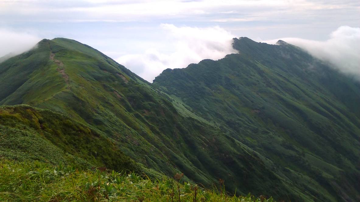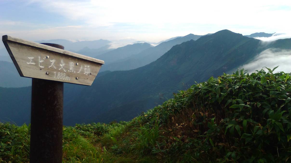 3日目 就寝後、突然強風が吹き出し時おり轟音と共にパラパラという音がし雨かなと思ったが雨ではなかった、一晩中風が吹いて熟睡できなかった。深夜にトイレに出て見たら風は吹いているが星がみえた。S氏も寝られなかったらしく3時前に起きだし4時前にヘッドランプを点けてスタートする。大障子の岩道を慎重に下り万太郎への登りになると道も良くなり、その内明るくなってきて天気も良く頂上では一瞬富士山が見えた。万太郎山には土合〜土樽に通じる万太郎越えという山スキールートがあり懐かしい。これから毛渡沢乗越への登山道は美しい笹尾根で右の毛渡沢と左の赤谷川で特に分水嶺を意識させられる。毛渡沢乗越からは今回の縦走で最後の長い急登になる。もうすぐかと思うと霧の中からピークが現れ何度かだまされてやっとエビス大黒の頭に着いた。もう仙ノ倉は近い。登りをじっくり味わいながら、谷川連峰の最高峰に着いた。そして歩いてきた白毛門、清水峠に視線を向ける。S氏は11:15のバスで越後湯沢、土合に戻るので私も同行する。最後のピーク平標で立ち止まり松手山経由でいっきに下山した。