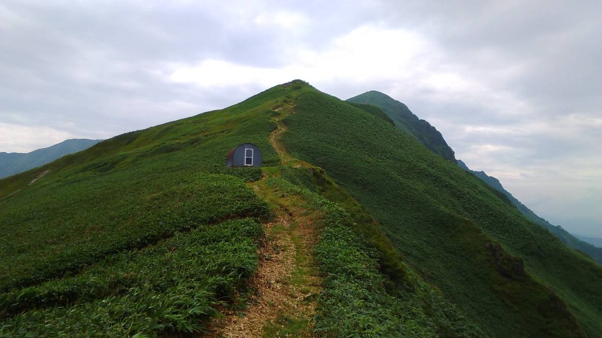 2日目 昨夜の避難小屋は先客が一名いて大障子まで行くという(あとで名前を聞いたところS氏千葉県在住)S氏とは今日の行程が長帳場なること、小屋の状況や水場のことなど雑談していた。空が白みはじめた頃S氏を追ってスタート。昨日からの長い休息で体調はベスト、朝のすがすがしい気温で登りも快適。大源太山を近くに見ながら七つ小屋山へそして笹を掻き分け蓬峠へ。蓬からは道の整備がよく、幅広く笹が刈ってあった。長い登りで武能岳と茂倉岳へ、万太郎谷を隔ててピラミダルな万太郎山が見えるがまだ遠い。一ノ倉岳で岩壁郡の眺めを期待していたが、群馬側はガスで全く見えない。トマの耳(谷川岳頂上)を越えて肩の小屋のベンチで靴を脱いでマナイタグラの稜線を見ながら大休憩と思ったが群馬側は相変わらずガスで見えなかった。そのうち途中で抜いたS氏もやって来た。今日、最後の登りオジカ沢の頭の岩尾根を登ると左手はなだらかな赤谷川の源頭になり小障子を越えると避難小屋に到着である。水くみから戻るとS氏も到着した。そして楽しい早めの晩餐、色々な山の話(過去にS氏が冬の富士山と冬の西穂で遭難した)、マラソンの話など話題が尽きない就寝まえのひと時であった。