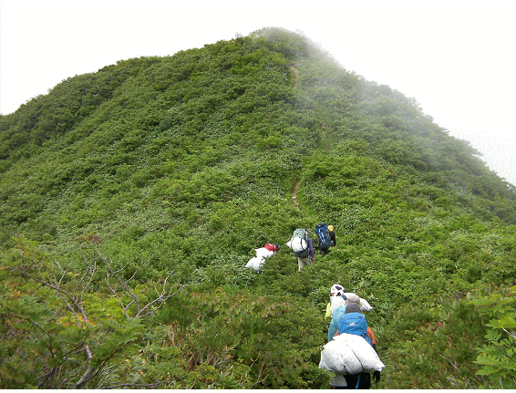 朝の7時に日暮沢小屋に集合し,参加者全員でヤシネットなどの資材を手分けして担ぎ,いつの間にか我々は先頭グループに付いて歩く.
