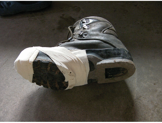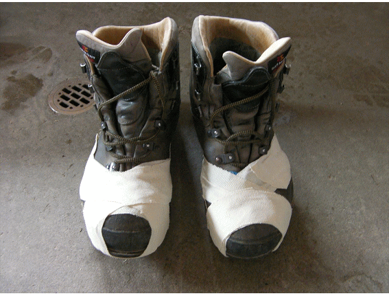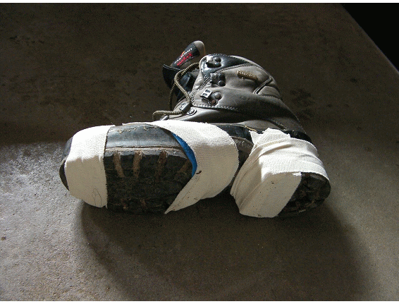左足の靴も剥げてしまうと大変まずいので,両足の靴をテーピングテープで補修する.