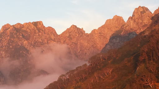 日没近くなって雲が切れて夕日がさし、小窓尾根が真っ赤に燃えた。壊れたカメラが恨めしかった。