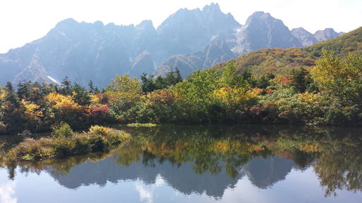 池ノ平小屋の前で管理人が椅子を出してくれたので、しばらく裏劔の眺めを堪能してから先を急ぐ。池ノ平、仙人峠、仙人池と少しずつ角度を変えて裏剣の景観を楽しめるが、残念ながら秋は朝しか八ッ峰に日があたらない。池ノ平も仙人池も紅葉には少し早かった。