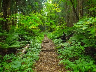歩き始めは杉林の中をだらだらと真っ直ぐな道が続きます。帰ってから知りましたが、この道は昔の鉄道跡だそうです。
