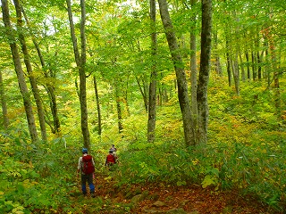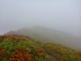 御滝神社から先は傾斜がきつくなり本格的な山道です。なかなかこたえる登りですが、ブナの美林に癒されます。晴れていれば山頂から360度の展望があるようですが、残念ながら今回はガスの中。小屋で昼食を取り、転がるように下りました。