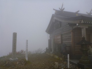 <もうすぐ山頂 残念ながらガスガス> <山頂の三吉神社奥宮>