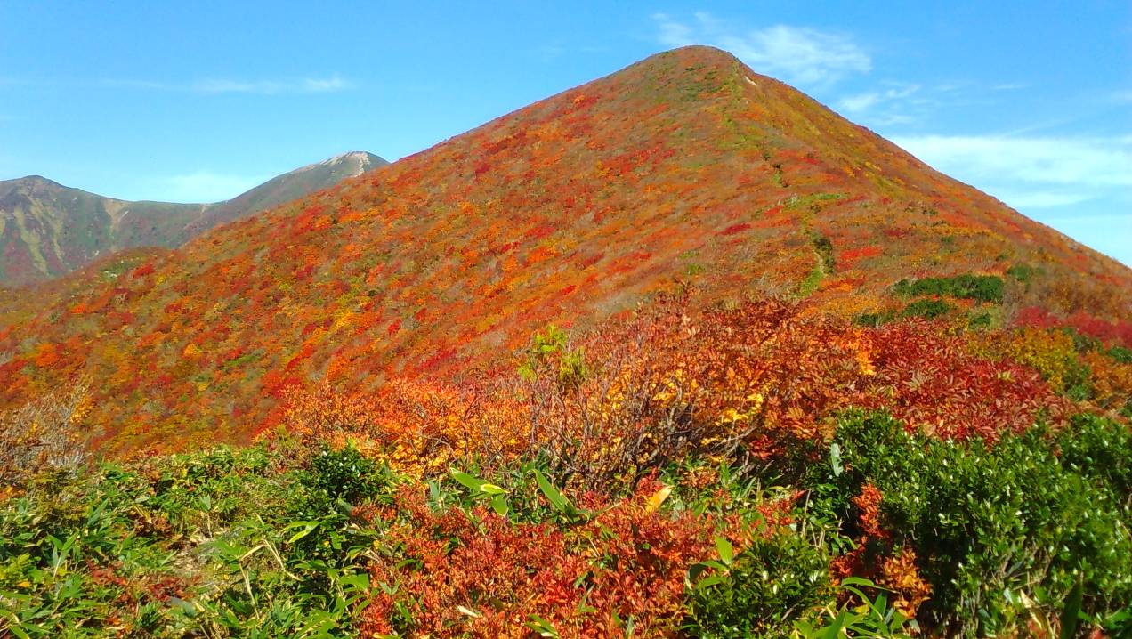 北大玉山の紅葉左の奥は大朝日岳