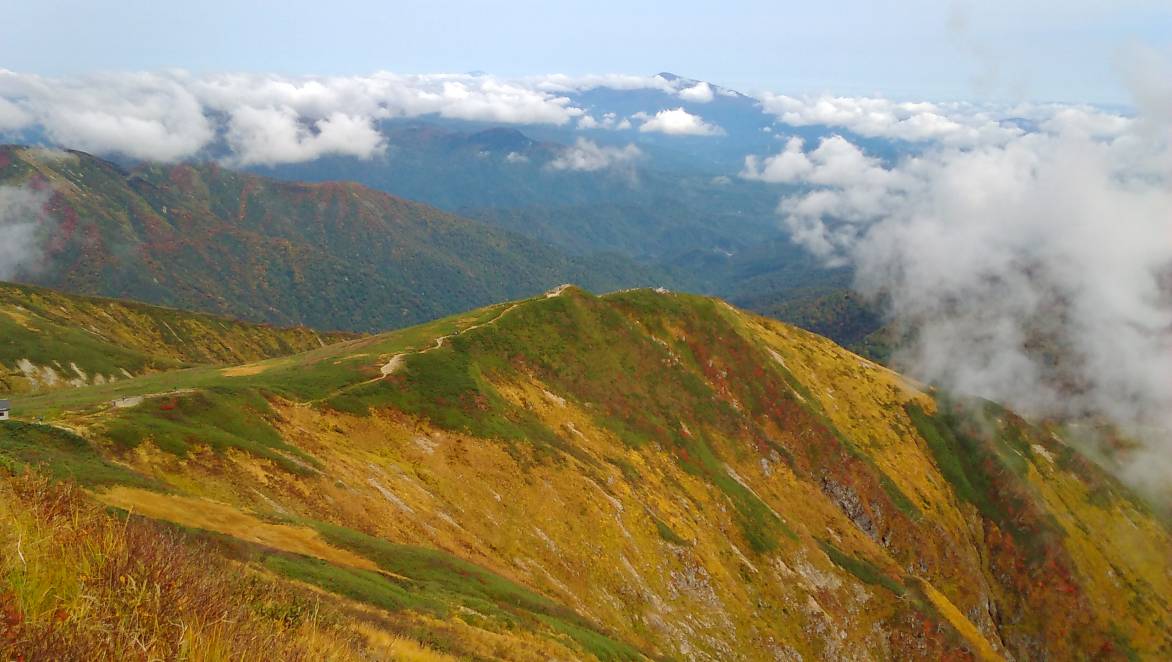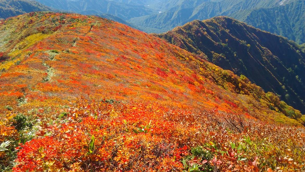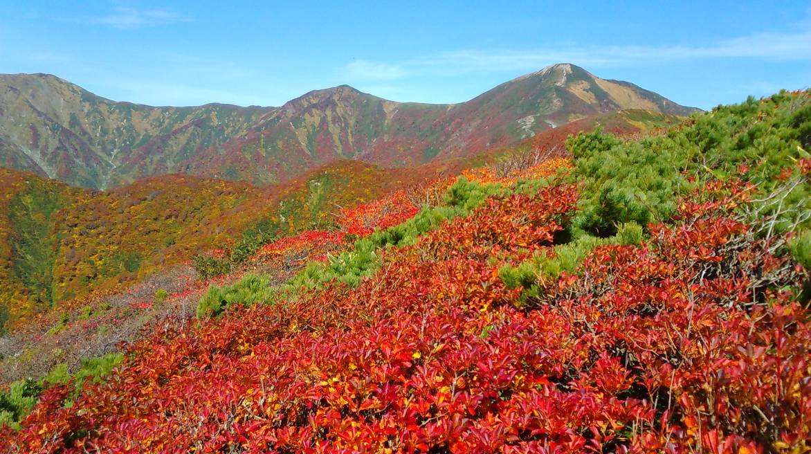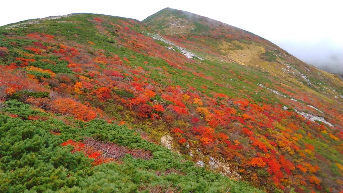 昨年はこの辺りで運よく「なめこ」を見つけたが今年は無い、角楢小屋を過ぎ大玉沢の一本つり橋を渡ると蛇引尾根の登りになる。森林限界を抜けると期待以上に北大玉山は真っ赤に紅葉していた、毎年来ているがこんな紅葉は初めてだ。少々ガスが沸き大朝日や荒川源流対岸の袖朝日の稜線は見えない、真っ赤な稜線が平岩山へと続いている。平岩山から大朝日岳へもハイ松と紅葉のコントラストが綺麗だった。下山する頃にはガスも晴れて写真を撮りながら下る。