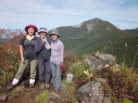 山頂で昼食を取っていると、今までガスに隠れていた雨飾山が顔を出す。慌てて記念撮影を。