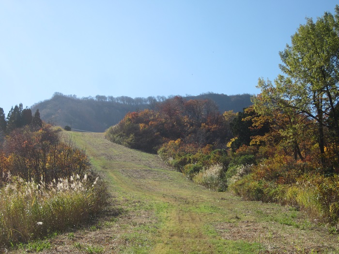 登山開始。ゴンドラ山頂駅まで、スキー場のゲレンデを登ります。これがキツイ急坂。
