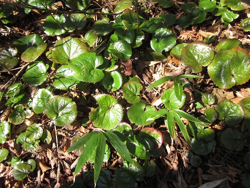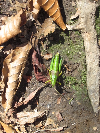 バッタがいたるところに! 山頂あたりはイワカガミが群生
